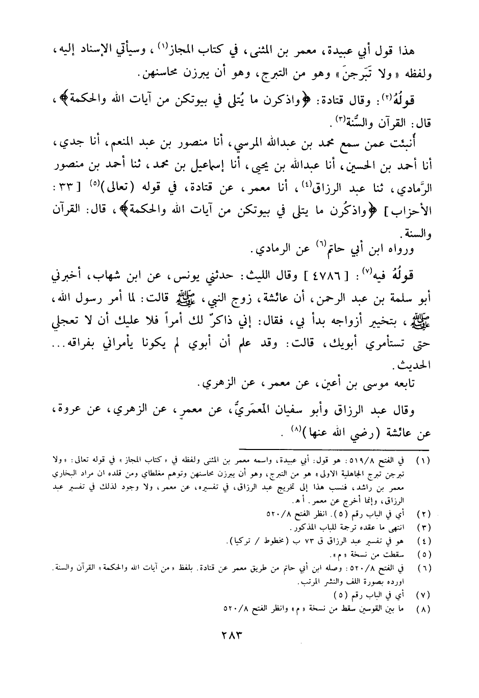 أنبئت عَمَّن سمع مُحَمَّد بن عبد الله المرسي أَنا مَنْصُور بن عبد الْمُنعم أَنا جدي أَنا أَحْمد بْنُ الْحُسَيْنِ أَنا عَبْدُ اللَّهِ بن يحيى أَنا إِسْمَاعِيل بن مُحَمَّد ثَنَا أَحْمد بن مَنْصُور الرَّمَادِي ثَنَا عبد الرَّزَّاق أَنا معمر عَن قَتَادَة فِي قَوْله تَعَالَى 33 الْأَحْزَاب {وَاذْكُرْنَ مَا يُتْلَى فِي بُيُوتِكُنَّ من آيَات الله وَالْحكمَة} قَالَ الْقُرْآن وَالسّنة
