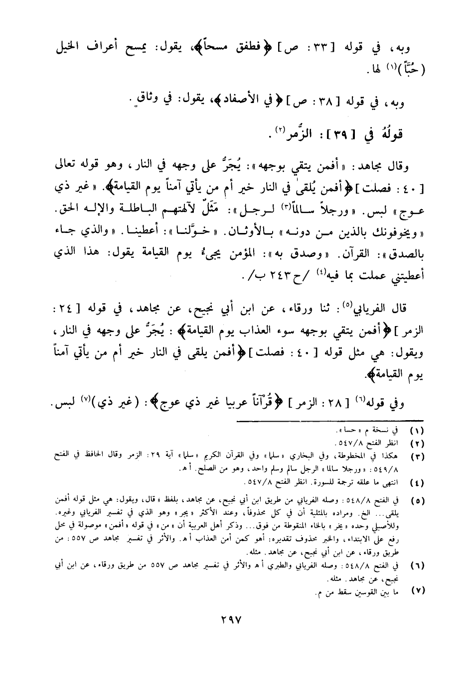 وَقَالَ مُجَاهِد أَفَمَنْ يَتَّقِي بِوَجْهِهِ يجر على وَجهه فِي النَّار وَهُوَ قَوْله تَعَالَى 40 فصلت {أَفَمَنْ يُلْقَى فِي النَّارِ خَيْرٌ أَمْ مَنْ يَأْتِي آمِنًا يَوْمَ الْقِيَامَة} غير ذِي عوج لبس ورجلا سالما لرجل مثل لألهتهم الْبَاطِلَة والإله الْحق وَيُخَوِّفُونَكَ بالذين من دونه بالأوثان خولنا أعطينا وَالَّذِي جَاءَ بِالصّدقِ الْقُرْآن وَصدق بِهِ الْمُؤمن يحيء يَوْم الْقِيَامَة يَقُول هَذَا الَّذِي أَعْطَيْتنِي عملت بِمَا فِيهِ ح 243 ب