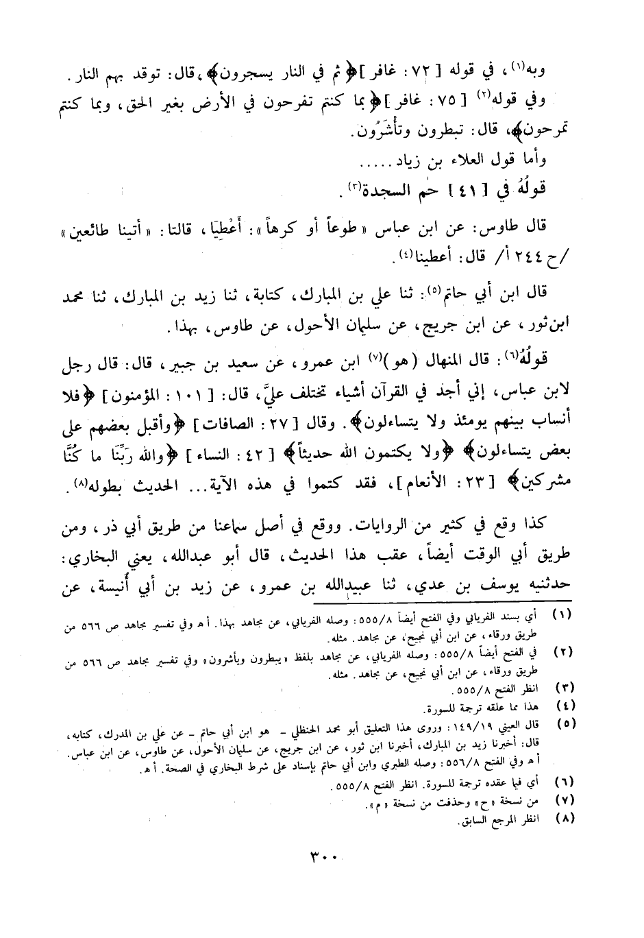 قَالَ ابْنُ أَبِي حَاتِمٍ ثَنَا عَلِيُّ بْنُ الْمُبَارَكِ كِتَابَةً ثَنَا زَيْدُ بْنُ الْمُبَارَكِ ثَنَا مُحَمَّد ابْنِ ثَوْرٍ عَنِ ابْنِ جُرَيْجٍ عَنْ سُلَيْمَانَ الأَحْوَلِ عَنْ طَاوُسٍ بِهَذَا