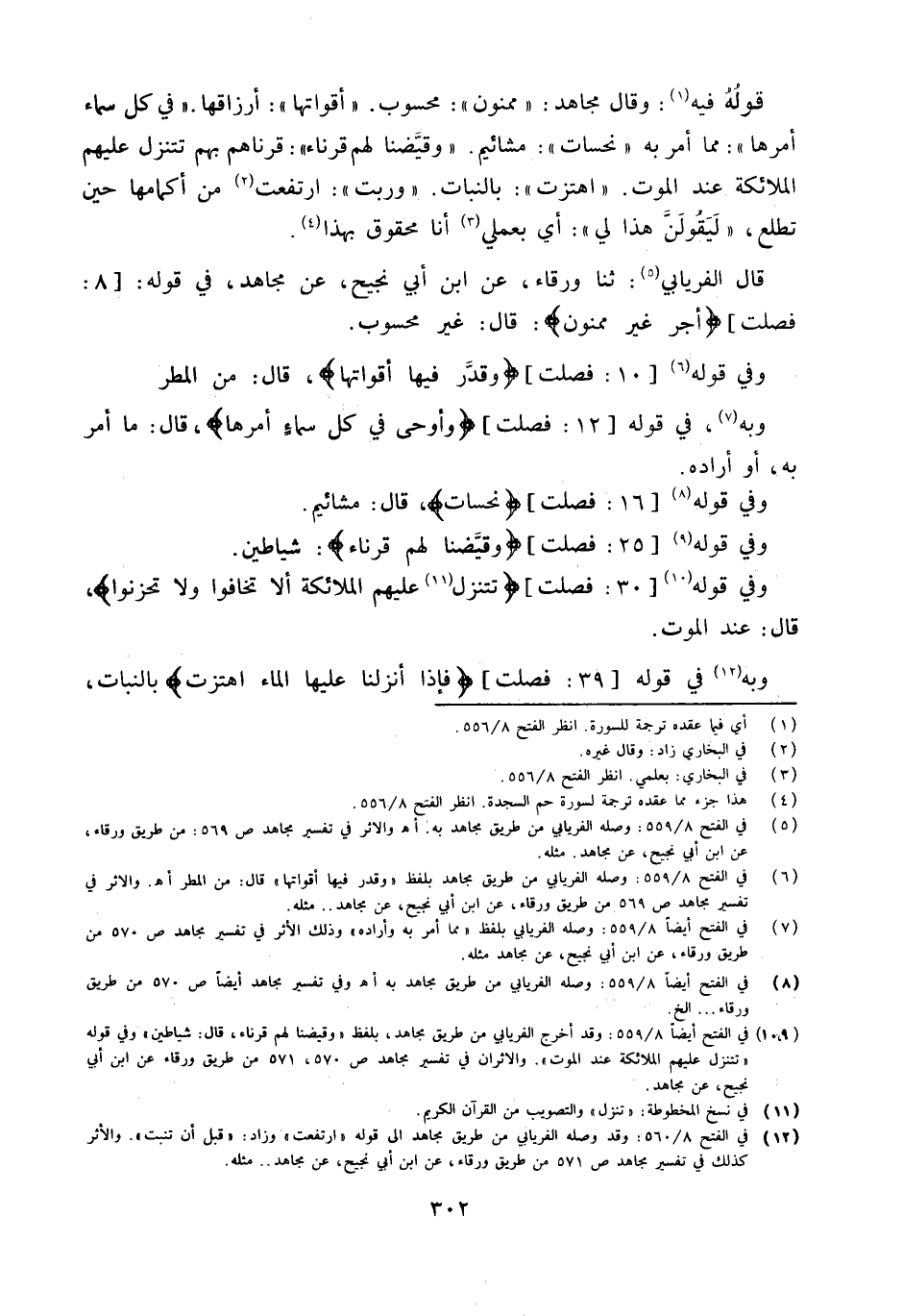 قَالَ الْفرْيَابِيّ ثَنَا وَرْقَاء عَن ابْن أبي نجيح عَن مُجَاهِد فِي قَوْله 8 فصلت {أجر غير ممنون} قَالَ غير مَحْسُوب
