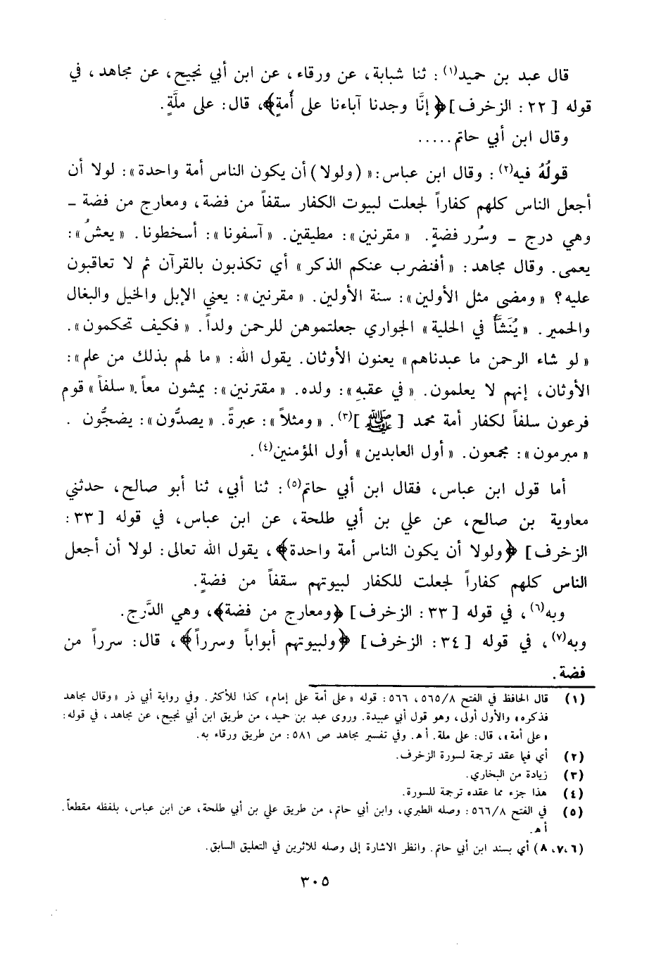 أما قَول ابْن عَبَّاس فَقَالَ ابْن أبي حَاتِم ثَنَا أَبِي ثَنَا أَبُو صَالِحٍ حَدَّثَني مُعَاوِيَةُ بْنُ صَالِحٍ عَنْ عَلِيِّ بْنِ أَبِي طَلْحَةَ عَنِ ابْن عَبَّاس فِي قَوْله 33 الزخرف {وَلَوْلا أَنْ يَكُونَ النَّاسُ أُمَّةً وَاحِدَة} يَقُولُ اللَّهُ تَعَالَى لَوْلا أَنْ أجعَل النَّاس كلهم كفَّارًا لجعلت لِلْكُفَّارِ لِبُيُوتِهِمْ سَقْفًا مِنْ فِضَّةٍ