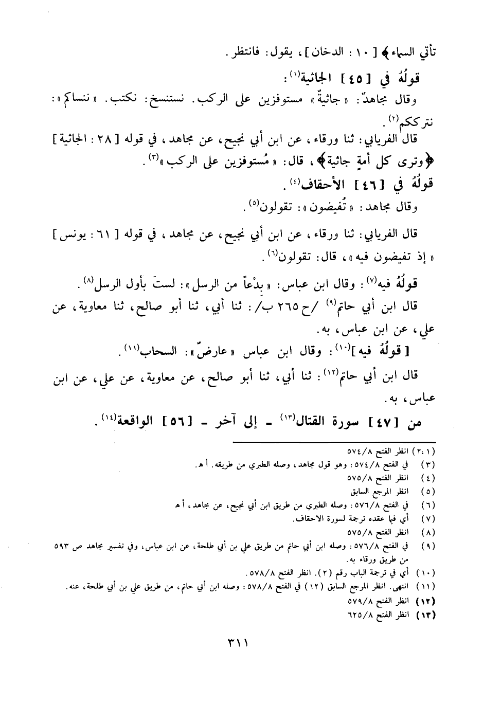 قَالَ الْفرْيَابِيّ ثَنَا وَرْقَاء عَن ابْن أبي نجيح عَن مُجَاهِد فِي قَوْله 28 الجاثية {وَترى كل أمة جاثية} قَالَ مستوفزين على الركب