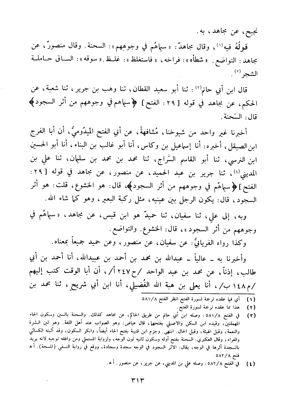 أخبرنَا غير وَاحِد من شُيُوخنَا مشافهة عَن أبي الْفَتْح الْمَيْدُومِيُّ أَن أَبَا الْفرج ابْن الصيقل أخبرهُ أَنا إِسْمَاعِيل بن وكاس أَنا أَبُو غَالب بن الْبناء أَنا أَبُو الْحُسَيْن ابْن النَّرْسِي ثَنَا أَبُو الْقَاسِم السراج ثَنَا مُحَمَّد بن مُحَمَّد بن سُلَيْمَان ثَنَا عَليّ بن الْمَدِينِيّ ثَنَا جرير بن عبد الحميد عَن مَنْصُور عَن مُجَاهِد فِي قَوْله 29 الْفَتْح {سِيمَاهُمْ فِي وُجُوهِهِمْ مِنْ أَثَرِ السُّجُود} قَالَ هُوَ الْخُشُوع قلت هُوَ أثر السُّجُود قَالَ يكون الرجل بَين عَيْنَيْهِ مثل ركبة الْبَعِير وَهُوَ كَمَا شَاءَ الله