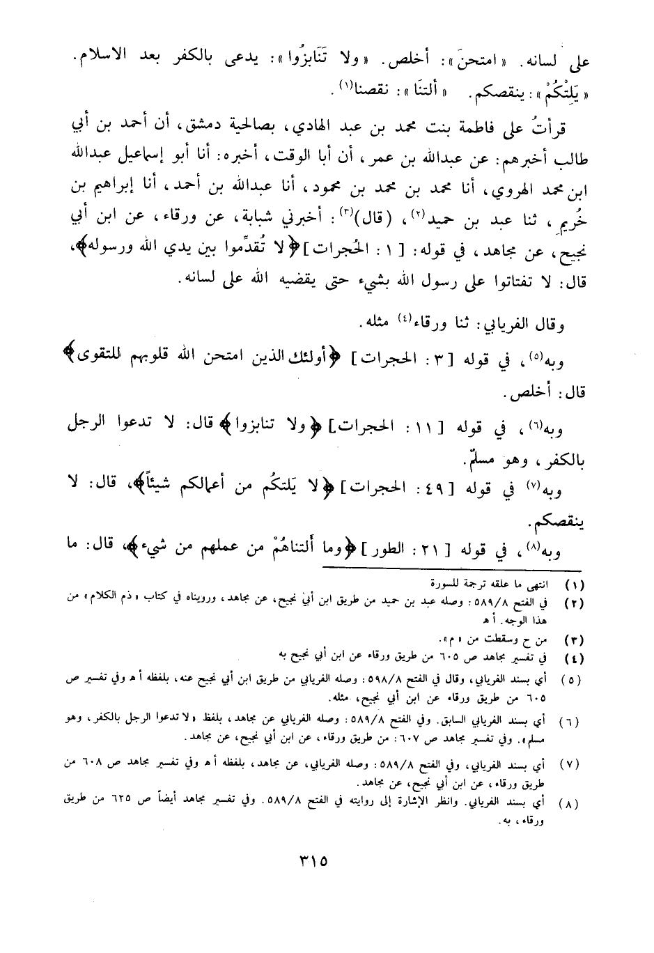 قَرَأت على فَاطِمَةَ بِنْتِ مُحَمَّدِ بْنِ عَبْدِ الْهَادِي بصالحية دمشق أَن أَحْمد بن أبي طَالب أخْبرهُم عَن عَبْدِ اللَّهِ بْنِ عُمَرَ أَنَّ أَبَا الْوَقْت أخبرهُ أَنا أَبُو إِسْمَاعِيل عبد الله ابْن مُحَمَّد الْهَرَوِيّ أَنا مُحَمَّد بن مُحَمَّد بن مَحْمُود أَنا عبد اللَّهِ بْنُ أَحْمَدَ أَنا إِبْرَاهِيمُ بْنُ خُرَيْمٍ ثَنَا عَبْدُ بْنُ حميد قَالَ أَخْبرنِي شَبابَة عَن وَرْقَاء عَن ابْن أبي نجيح عَن مُجَاهِد فِي قَوْله 1 الحجرات {لَا تُقَدِّمُوا بَيْنَ يَدَيِ اللَّهِ وَرَسُوله} قَالَ لَا تفتاتوا على رَسُول الله بِشَيْء حَتَّى يَقْضِيه الله على لِسَانه