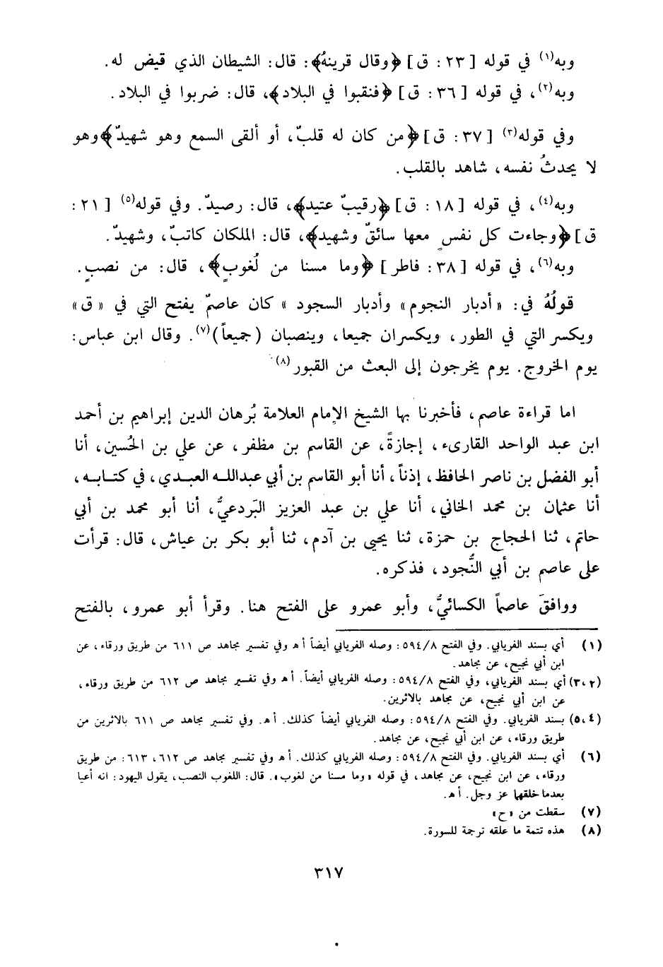 أدبار النُّجُوم وأدبار السُّجُود كَانَ عَاصِم يفتح الَّتِي فِي ق وَيكسر الَّتِي فِي الطّور ويكسران جَمِيعًا وينصبان جَمِيعًا وَقَالَ ابْن عَبَّاس يَوْم الْخُرُوج يَوْم يخرجُون إِلَى الْبَعْث من الْقُبُور