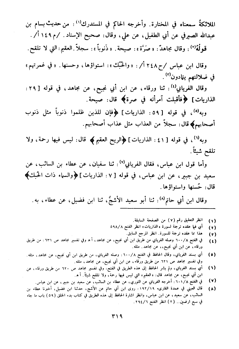 وَأما قَول ابْن عَبَّاس فَقَالَ الْفِرْيَابِيُّ ثَنَا سُفْيَانُ عَنْ عَطَاءِ بْنِ السَّائِبِ عَنْ سَعِيدِ بْنِ جُبَيْرٍ عَنِ ابْنِ عَبَّاس فِي قَوْله 7 الذاريات {وَالسَّمَاء ذَات الحبك} قَالَ حُسْنُهَا وَاسْتِوَاؤُهَا