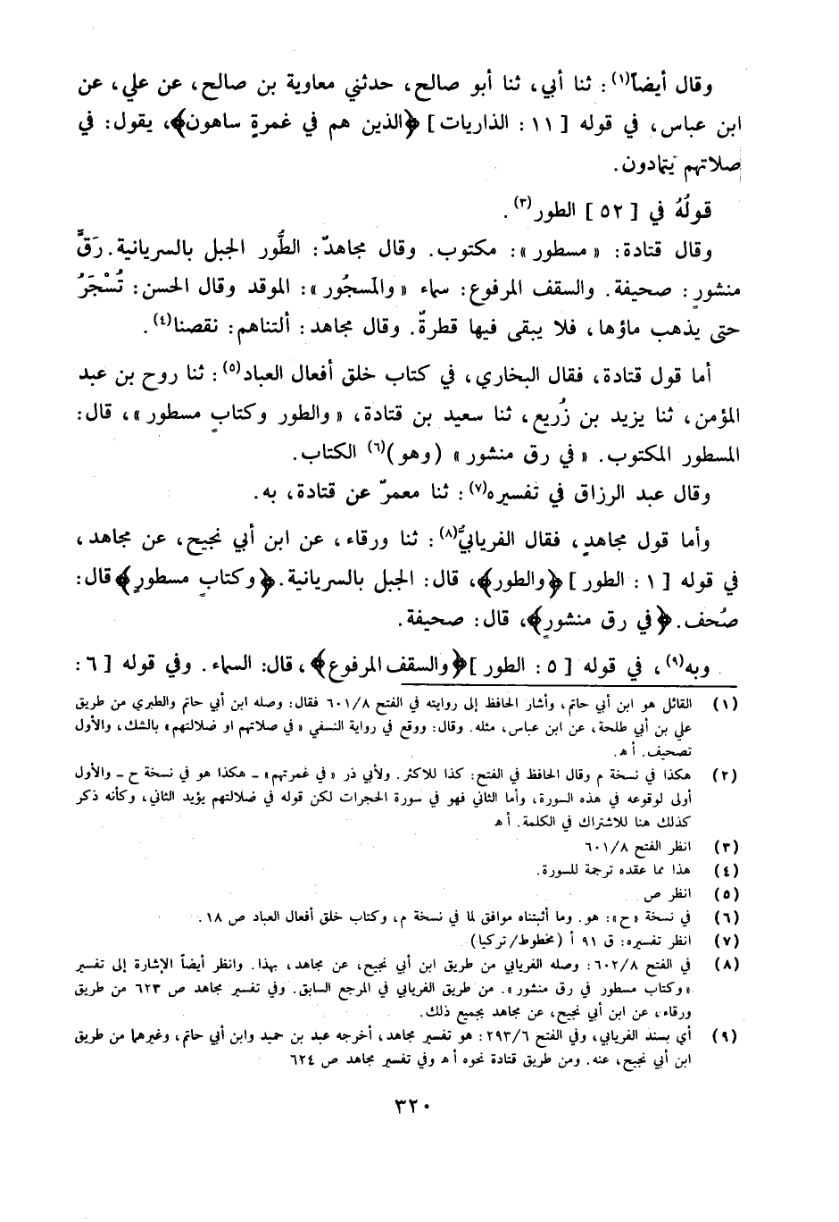 وَأما قَول مُجَاهِد فَقَالَ الْفرْيَابِيّ ثَنَا وَرْقَاء عَن ابْن أبي نجيح عَن مُجَاهِد فِي قَوْله 1 الطّور {وَالطور} قَالَ الْجَبَل بالسُّرْيَانيَّة {وَكِتَابٍ مَسْطُورٍ} قَالَ صحف {فِي رَقٍّ مَنْشُورٍ} قَالَ صحيفَة