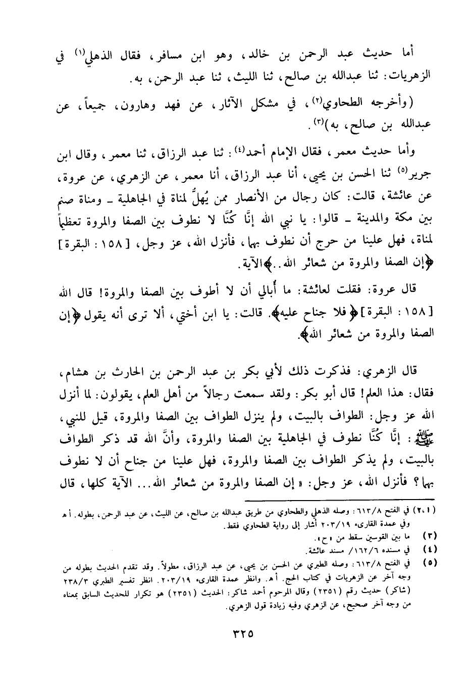 وَأما حَدِيث معمر فَقَالَ الإِمَامُ أَحْمَدُ ثَنَا عَبْدُ الرَّزَّاقِ ثَنَا مَعْمَرٌ وَقَالَ ابْنُ جَرِيرٍ ثَنَا الْحَسَنُ بْنُ يَحْيَى أَنا عَبْدُ الرَّزَّاقِ أَنا مَعْمَرٌ عَنِ الزُّهْرِيِّ عَنْ عُرْوَةَ عَنْ عَائِشَةَ قَالَتْ كَانَ رِجَالٌ مِنَ الأَنْصَارِ مِمَّنْ يُهِلُّ لِمَنَاةَ فِي الْجَاهِلِيَّةِ وَمَنَاةُ صَنَمٌ بَيْنَ مَكَّةَ وَالْمَدِينَةِ قَالُوا يَا نَبِيَّ اللَّهِ إِنَّا كُنَّا لَا نَطُوفُ بَيْنَ الصَّفَا وَالْمَرْوَةِ تَعْظِيمًا لِمَنَاةَ فَهَلْ عَلَيْنَا مِنْ حَرَجٍ أَنْ نَطُوفَ بِهِمَا فَأَنْزَلَ اللَّهُ عز وَجل 158 الْبَقَرَة {إِنَّ الصَّفَا وَالْمَرْوَةَ مِنْ شَعَائِرِ الله} الآيَةَ