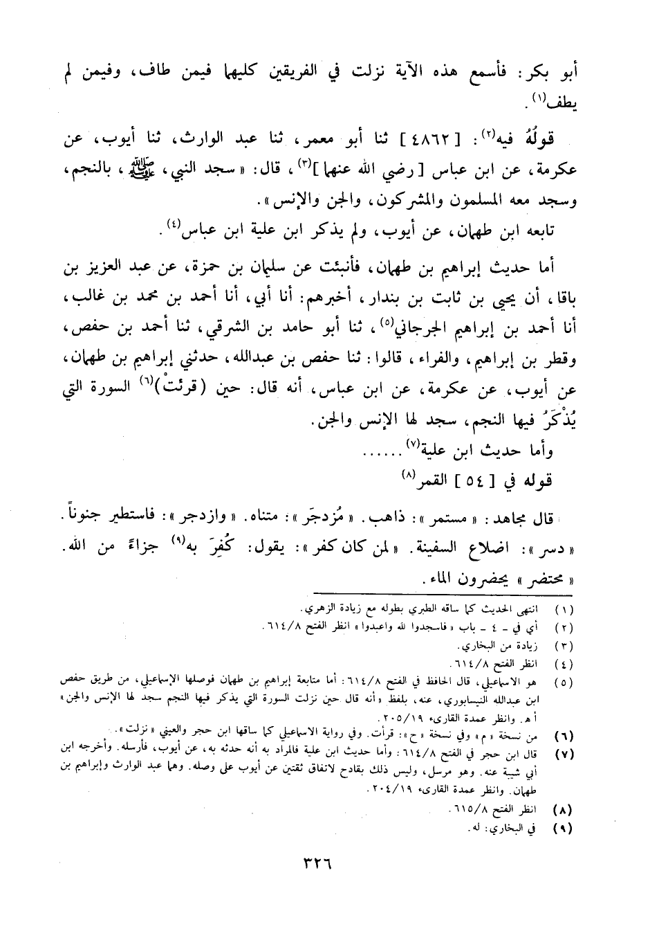 أما حَدِيث إِبْرَاهِيم بن طهْمَان فَأُنْبِئْتُ عَنْ سُلَيْمَانَ بْنِ حَمْزَةَ عَنْ عَبْدِ الْعَزِيزِ بْنِ بَاقَا أَنَّ يَحْيَى بْنَ ثَابِتِ بن بنْدَار أخْبرهُم أَنا أبي أَنا أَحْمَدُ بْنُ مُحَمَّدِ بْنِ غَالِبٍ أَنا أَحْمَدُ بْنُ إِبْرَاهِيمَ الْجُرْجَانِيُّ ثَنَا أَبُو حَامِدِ بْنُ الشَّرْقِيِّ ثَنَا أَحْمَدُ بْنُ حَفْصٍ وَقطر بْنُ إِبْرَاهِيمَ وَالْفَرَّاءُ قَالُوا ثَنَا حَفْص بن عبد الله حَدَّثَني إِبْرَاهِيم بن طهْمَان عَن أَيُّوبُ عَنْ عِكْرِمَةَ عَنِ ابْنِ عَبَّاسٍ أَنَّهُ قَالَ حِينَ قُرِئَتِ السُّورَةُ الَّتِي يُذْكَرُ فِيهَا النَّجْمُ سَجَدَ لَهَا الإِنْسُ وَالْجِنُّ