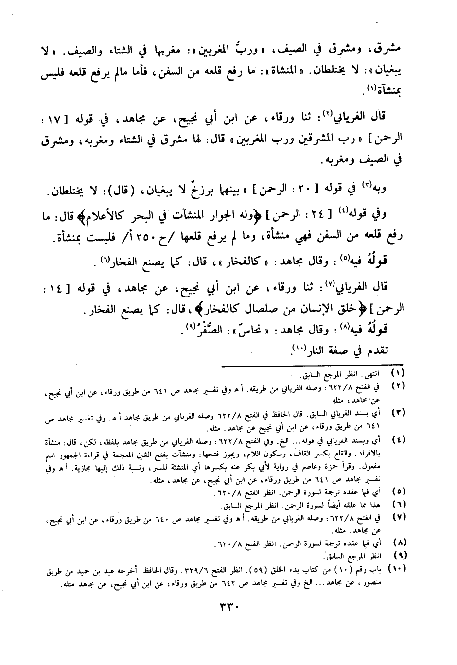 قَالَ الْفرْيَابِيّ ثَنَا وَرْقَاء عَن ابْن أبي نجيح عَن مُجَاهِد فِي قَوْله 17 الرَّحْمَن رب المشرقين وَرب المغربين قَالَ لَهَا مشرق فِي الشتَاء ومغربه ومشرق فِي الصَّيف ومغربه