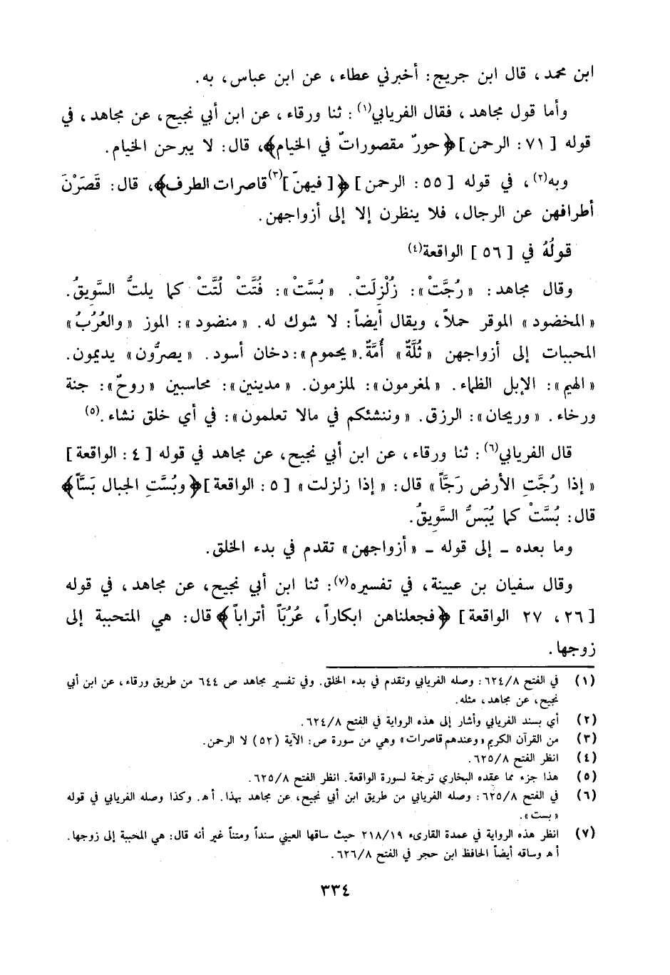 وَأما قَول مُجَاهِد فَقَالَ الْفرْيَابِيّ ثَنَا وَرْقَاء عَن ابْن أبي نجيح عَن مُجَاهِد فِي قَوْله 71 الرَّحْمَن {حور مقصورات فِي الْخيام} قَالَ لَا يبرحن الْخيام