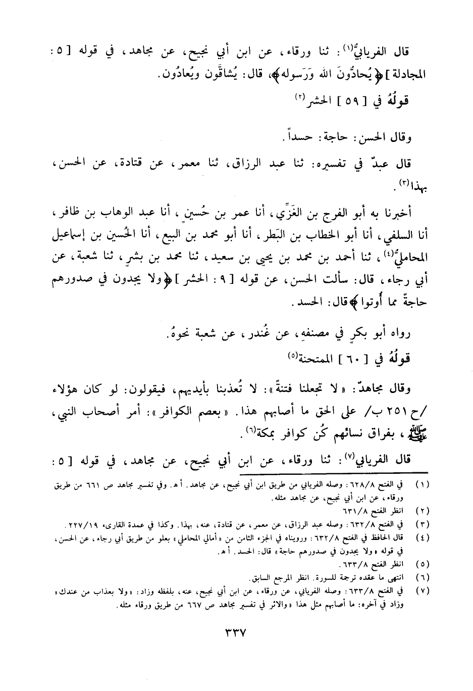 قَالَ الْفِرْيَابِيُّ ثَنَا وَرْقَاء عَن ابْن أبي نجيح عَن مُجَاهِد فِي قَوْله 5