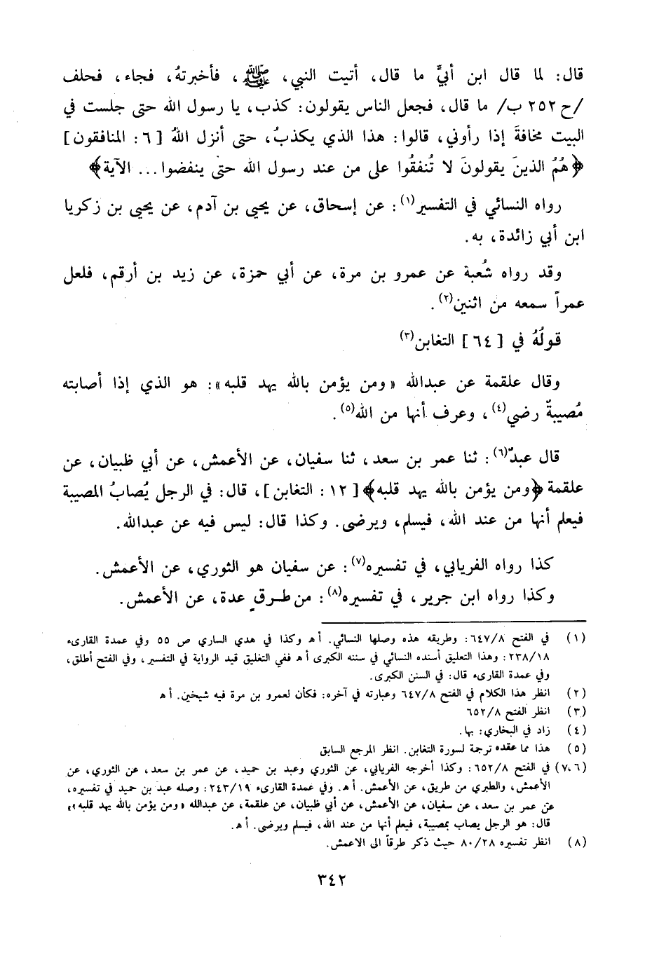قَالَ عبد ثَنَا عمر بن سعد ثَنَا سُفْيَان عَن الْأَعْمَش عَنْ أَبِي ظَبْيَانَ عَنْ عَلْقَمَةَ {وَمَنْ يُؤْمِنْ بِاللَّهِ يَهْدِ قَلْبَهُ} 12 التغابن قَالَ فِي الرجل يصاب الْمُصِيبَة فَيعلم أَنَّهَا من عِنْد الله فَيسلم ويرضى وَكَذَا قَالَ لَيْسَ فِيهِ عَن عبد الله
