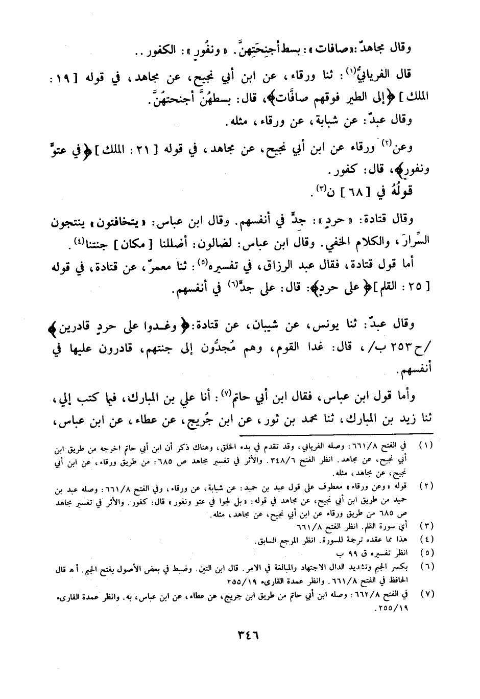 قَالَ الْفرْيَابِيّ ثَنَا وَرْقَاء عَن ابْن أبي نجيح عَن مُجَاهِد فِي قَوْله 19 الْملك {إِلَى الطير فَوْقهم صافات} قَالَ بسطهن أجنحتهن