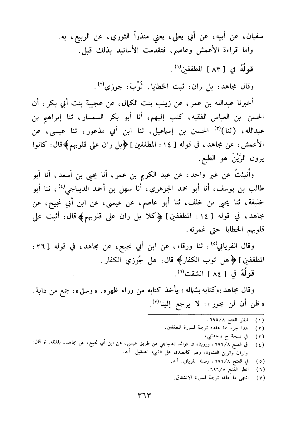 وأنبئت عَن غير وَاحِد عَن عبد الْكَرِيم بن عمر أَنا يحيى بن أسعد أَنا أَبُو طَالب بن يُوسُف أَنا أَبُو مُحَمَّد الْجَوْهَرِي أَنا سهل بن أَحْمد الديباجي ثَنَا أَبُو خَليفَة ثَنَا يحيى بن خلف ثَنَا أَبُو عَاصِم عَن عِيسَى عَن ابْن أبي نجيح عَن مُجَاهِد فِي قَوْله 14 المطففين {كَلَّا بَلْ رَانَ عَلَى قُلُوبِهِمْ} قَالَ أثبت على قُلُوبهم الْخَطَايَا حَتَّى غمرته