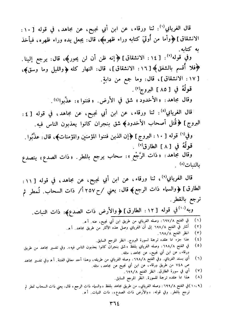 قَالَ الْفرْيَابِيّ ثَنَا وَرْقَاء عَن ابْن أبي نجيح عَن مُجَاهِد فِي قَوْله الطارق {وَالسَّمَاء ذَات الرجع} قَالَ يَعْنِي ذَات السَّحَاب تمطر ثمَّ ترجع بالقطر