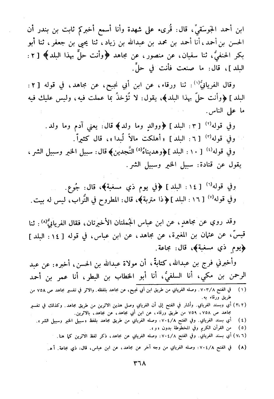 ابْن أَحْمد الجوسقي قَالَ قرئَ على شهدة وَأَنا أسمع أخْبركُم ثَابت بن بندر أَن الْحسن بن أَحْمد أَنا أَحْمد بن مُحَمَّد بْنُ عَبْدِ اللَّهِ بْنِ زِيَادٍ ثَنَا يحى بن جَعْفَر ثَنَا أَبُو بكر الْحَنَفِيّ ثَنَا سُفْيَان عَن مَنْصُور عَن مُجَاهِد {وَأَنْتَ حِلٌّ بِهَذَا الْبَلَدِ} 2 الْبَلَد قَالَ مَا صنعت فَأَنت فِي حل