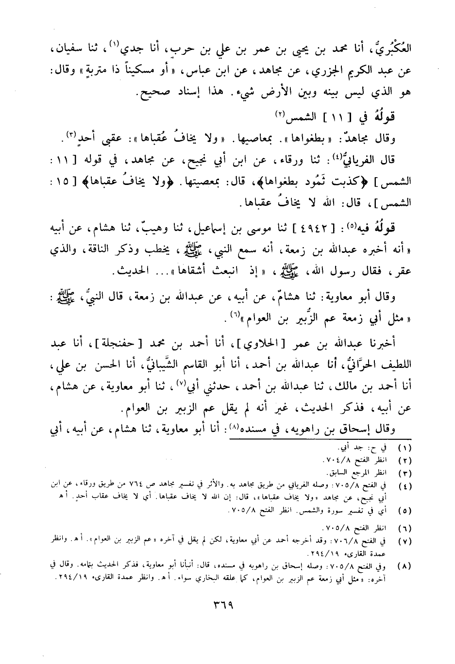 قَالَ الْفرْيَابِيّ ثَنَا وَرْقَاء عَن ابْن أبي نجيح عَن مُجَاهِد فِي قَوْله 11 الشَّمْس {كذبت ثَمُود بطغواها} قَالَ بمعصيتها {وَلا يَخَافُ عُقْبَاهَا} 15 الشَّمْس قَالَ الله لَا يخَاف عقباها