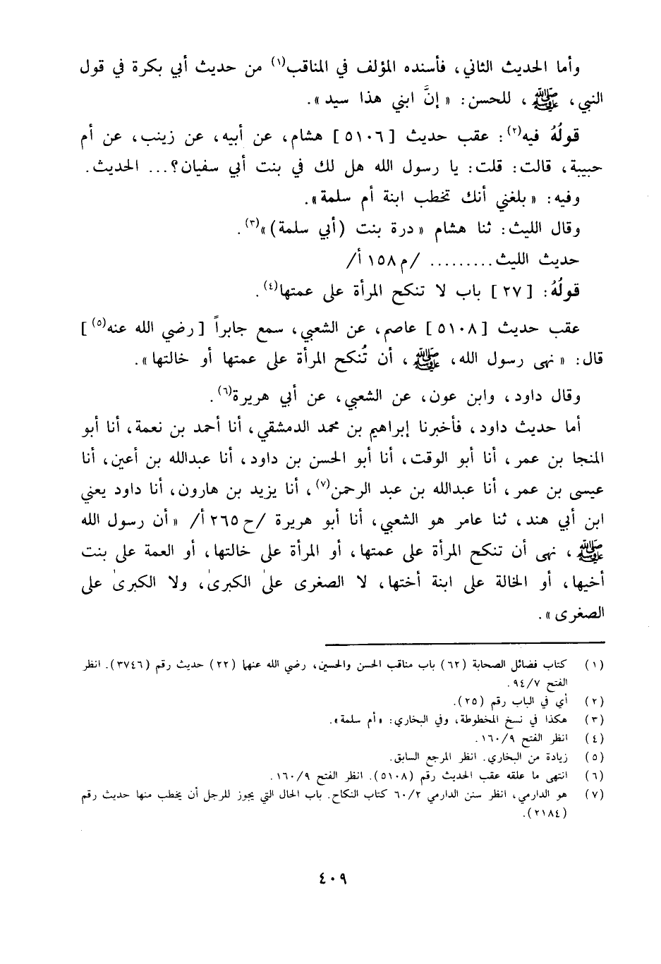 وَأما حَدِيث دَاوُد فَأَخْبَرَنَا إِبْرَاهِيمُ بْنُ مُحَمَّدٍ الدِّمَشْقِيُّ أَنا أَحْمَدُ بْنُ نِعْمَةَ أَنا أَبُو الْمُنَجَّا بْنُ عمر أَنا أَبُو الْوَقْت أَنا أَبُو الْحَسَنِ بْنُ دَاوُدَ أَنا عَبْدُ اللَّهِ بْنُ أَعْيَنَ أَنا عِيسَى بْنُ عُمَرَ أَنا عَبْدُ اللَّهِ بْنُ عَبْدِ الرَّحْمَنِ أَنا يَزِيدُ بْنُ هَارُونَ أَنا دَاوُدُ يَعْنِي ابْنَ أَبِي هِنْدٍ ثَنَا عَامِرٌ هُوَ الشَّعْبِيُّ أَنا أَبُو هُرَيْرَة / ح 265 أ / أَنَّ رَسُولَ اللَّهِ صَلَّى اللَّهُ عَلَيْهِ وَسَلَّمَ نَهَى أَنْ تُنْكَحَ الْمَرْأَةُ عَلَى عَمَّتِهَا أَوِ الْمَرَأَةُ عَلَى خَالَتِهَا أَوِ الْعَمَّةُ عَلَى بِنْتِ أَخِيهَا أَوِ الْخَالَةُ عَلَى ابْنَةِ أُخْتِهَا لَا الصُّغْرَى عَلَى الْكُبْرَى وَلا الْكُبْرَى عَلَى الصُّغْرَى