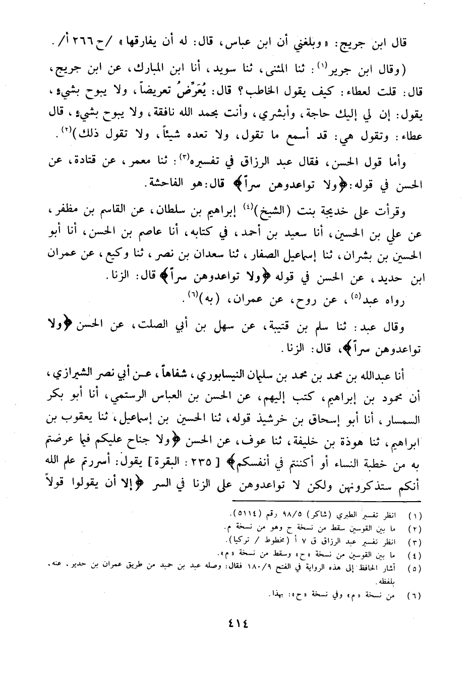 وقرأت على خَدِيجَة بنت الشَّيْخ إِبْرَاهِيم بن سُلْطَان عَن الْقَاسِم بن مظفر عَن عَليّ بن الْحُسَيْن أَنا سعيد بن أَحْمد فِي كِتَابه أَنا عَاصِم بن الْحسن أَنا أَبُو الْحُسَيْنِ بْنُ بِشْرَانَ ثَنَا إِسْمَاعِيل الصفار ثَنَا سَعْدَان بن نصر ثَنَا وَكِيع عَن عمرَان ابْن حَدِيد عَن الْحسن فِي قَوْله {لَا تواعدوهن سرا} قَالَ الزِّنَا