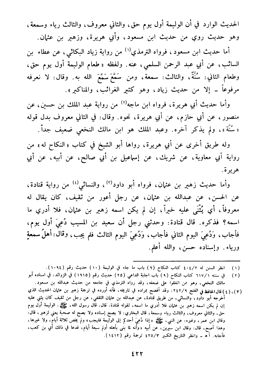 الحَدِيث الْوَارِد فِي أَن الْوَلِيمَة أول يَوْم حق وَالثَّانِي مَعْرُوف وَالثَّالِث رِيَاء وَسُمْعَة وَهُوَ حَدِيث رُوِيَ من حَدِيث ابْن مَسْعُود وَأبي هُرَيْرَة وَزُهَيْر بن عُثْمَان