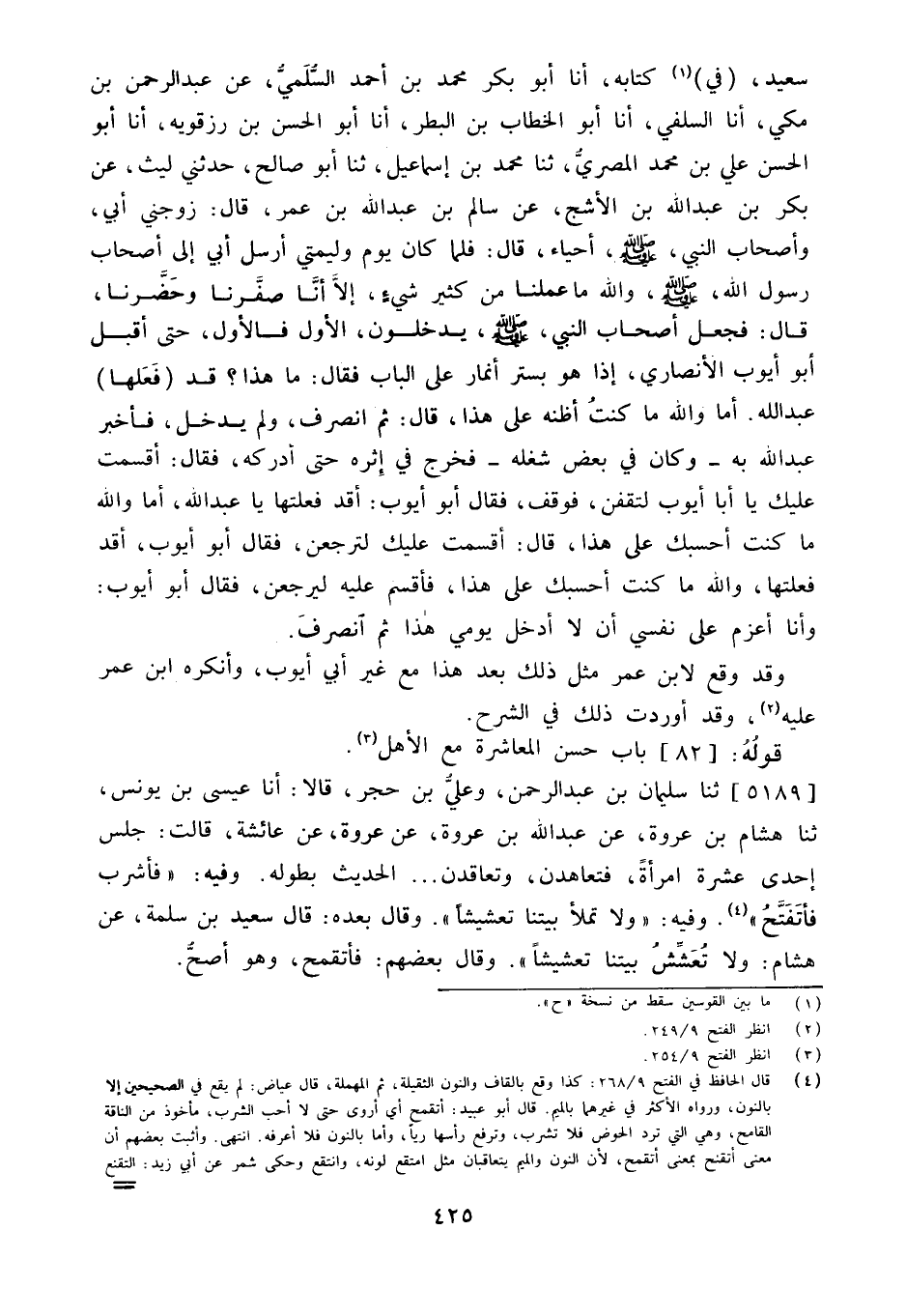 سَعِيدٍ فِي كِتَابِهِ أَنا أَبُو بَكْرٍ مُحَمَّدُ بْنُ أَحْمَدَ السُّلَمِيُّ عَن عبد الرَّحْمَن بن مكي أَنا السلَفِي أَنا أَبُو الْخطاب بْنُ الْبَطَرِ أَنا أَبُو الْحَسَنِ بْنُ رِزْقَوَيْهِ أَنا أَبُو الْحَسَنِ عَليّ بن مُحَمَّد الْمصْرِيّ ثَنَا مُحَمَّدُ بْنُ إِسْمَاعِيلَ ثَنَا أَبُو صَالِحٍ حَدَّثَنِي لَيْثٌ عَنْ بَكْرِ بْنِ عَبْدِ اللَّهِ بْنِ الأَشَجِّ عَن سَالم بن عبد الله بْنِ عُمَرَ قَالَ زَوَّجَنِي أَبِي وَأَصْحَابُ النَّبِيِّ صَلَّى اللَّهُ عَلَيْهِ وَسَلَّمَ أَحْيَاءٌ قَالَ فَلَمَّا كَانَ يَوْمُ وَلِيمَتِي أَرْسَلَ أَبِي إِلَى أَصْحَاب رَسُول الله اللَّهُ عَلَيْهِ وَسَلَّمَ وَاللَّهِ مَا عَملنَا من كثير شَيْء إِلا أَنَّا صَفَّرْنَا وَحَضَّرْنَا قَالَ فَجَعَلَ أَصْحَابُ النَّبِيِّ صَلَّى اللَّهُ عَلَيْهِ وَسَلَّمَ يَدْخُلُونَ الأَوَّلُ فَالأَوَّلُ حَتَّى أَقْبَلَ أَبُو أَيُّوبَ الأَنْصَارِيُّ إِذَا هُوَ بِسِتْرٍ أَنْمَارٍ عَلَى الْباب فَقَالَ مَا هَذَا قَدْ فَعَلَهَا عَبْدُ اللَّهِ أَمَا وَاللَّهِ مَا كُنْتُ أَظُنُّهُ عَلَى هَذَا قَالَ ثُمَّ انْصَرَفَ وَلَمْ يَدْخُلْ فَأُخْبِرَ عَبْدُ اللَّهِ بِهِ وَكَانَ فِي بَعْضِ شُغُلِهِ فَخَرَجَ فِي إِثْرِهِ حَتَّى أَدْرَكَهُ فَقَالَ أَقْسَمْتُ عَلَيْكَ يَا أَبَا أَيُّوبَ لَتَقِفَنَّ فَوَقَفَ فَقَالَ أَبُو أَيُّوبَ أَقَدْ فَعَلْتَهَا يَا عَبْدَ اللَّهِ أَمَا وَاللَّهِ مَا كُنْتُ أَحْسَبُكَ عَلَى هَذَا قَالَ أَقْسَمْتُ عَلَيْكَ لَتَرْجِعَنَّ فَقَالَ أَبُو أَيُّوبَ أَقَدْ فَعَلْتَهَا وَاللَّهِ مَا كُنْتُ أَحْسَبُكَ عَلَى هَذَا فَأَقْسَمَ عَلَيْهِ لَيَرْجِعَنَّ فَقَالَ أَبُو أَيُّوبَ وَأَنَا أَعْزِمُ عَلَى نَفْسِي أَنْ لَا أَدْخُلَ يَوْمِي هَذَا ثُمَّ انْصَرَفَ