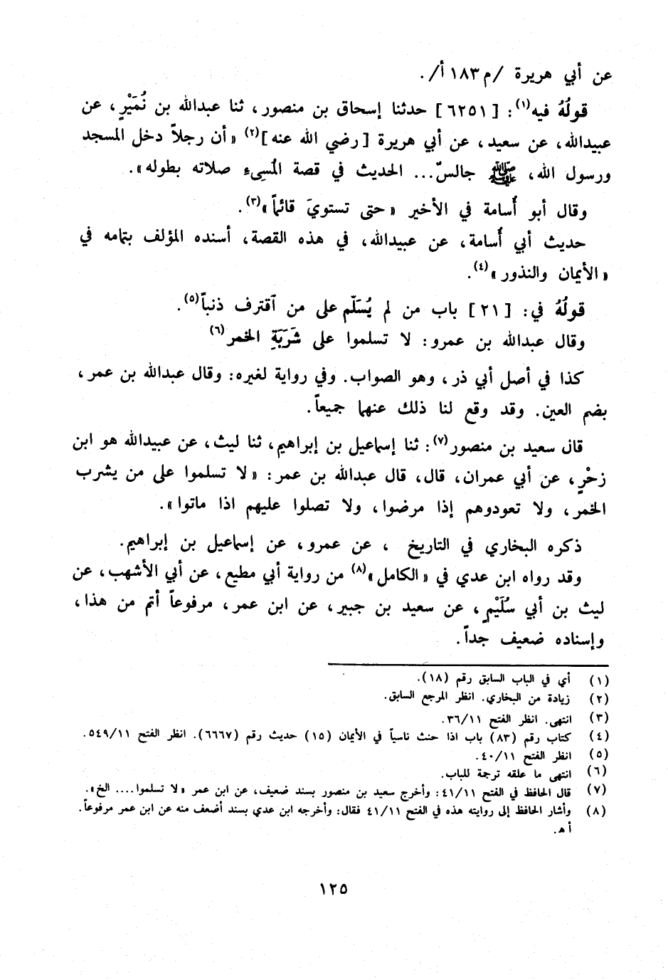 قَالَ سعيد بن مَنْصُورٍ ثَنَا إِسْمَاعِيلُ بْنُ إِبْرَاهِيمَ ثَنَا لَيْث عَن عبيد الله هُوَ ابْنُ زَحْرٍ عَنْ أَبِي عِمْرَانَ قَالَ قَالَ عَبْدُ اللَّهِ بْنُ عُمَرَ لَا تُسَلِّمُوا عَلَى مَنْ يَشْرَبُ الْخَمْرَ وَلا تَعُودُوهُمْ إِذَا مَرِضُوا وَلا تُصَلُّوا عَلَيْهِمْ إِذَا مَاتُوا