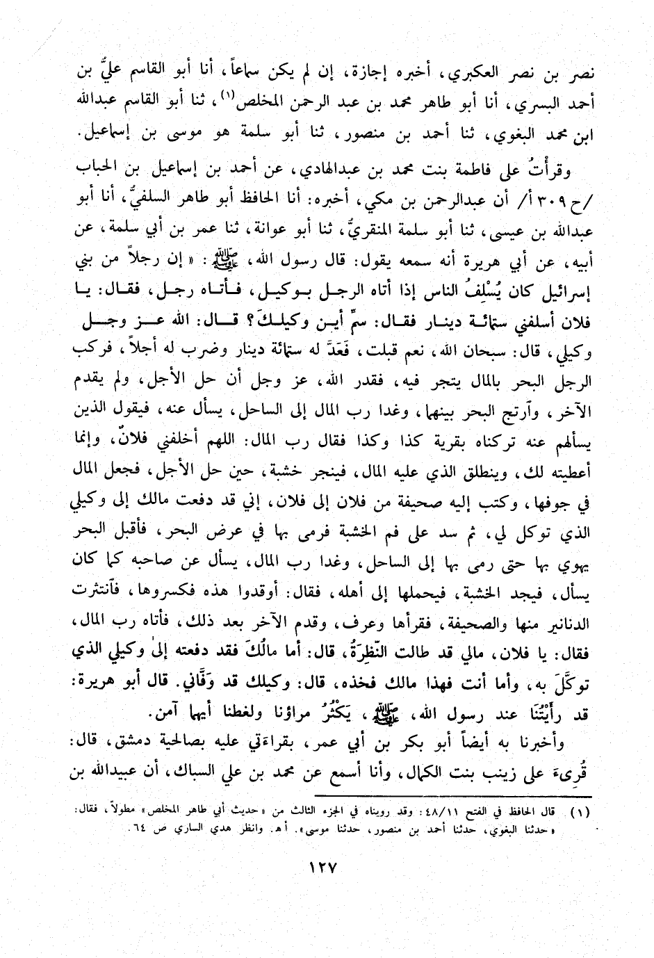 وَقَرَأْتُ عَلَى فَاطِمَةَ بِنْتِ مُحَمَّدِ بْنِ عَبْدِ الْهَادِي عَنْ أَحْمَدَ بْنِ إِسْمَاعِيلَ بن الْحباب ح 309 أأَنَّ عَبْدَ الرَّحْمَنِ بْنَ مَكِّيٍّ أخبرهُ أَنا الْحَافِظ أَبُو طَاهِر السِّلَفِيُّ أَنا أَبُو عَبْدِ اللَّهِ بْنُ عِيسَى ثَنَا أَبُو سَلَمَةَ الْمِنْقَرِيُّ ثَنَا أَبُو عَوَانَةَ ثَنَا عمر بن أبي سَلمَة عَن أَبِيهِ عَنْ أَبِي هُرَيْرَةَ أَنَّهُ سَمِعَهُ يَقُولُ قَالَ رَسُولُ اللَّهِ صَلَّى اللَّهُ عَلَيْهِ وَسَلَّمَ إِنَّ رَجُلا مِنْ بَنِي إِسْرَائِيلَ كَانَ يُسْلِفُ النَّاسَ إِذَا أَتَاهُ الرَّجُلُ بِوَكِيلٍ فَأَتَاهُ رَجُلٌ فَقَالَ يَا فلَان أَسْلفنِي سِتّمائَة دِينَارٍ فَقَالَ سَمِّ أَيْنَ وَكِيلُكَ قَالَ اللَّهُ عَزَّ وَجَلَّ وَكِيلِي قَالَ سُبْحَانَ اللَّهِ نَعَمْ قَبِلْتُ فعد لَهُ سِتّمائَة دِينَارٍ وَضَرَبَ لَهُ أَجَلا فَرَكِبَ الرَّجُلُ الْبَحْرَ بِالْمَالِ يَتَّجِرُ فِيهِ فَقَدَّرَ اللَّهُ عَزَّ وَجَلَّ أَنْ حَلَّ الأَجَلُ وَلَمْ يَقْدَمِ الآخَرُ وَارْتَجَّ الْبَحْرُ بَيْنَهُمَا وَغَدَا رَبُّ الْمَالِ إِلَى السَّاحِلِ يَسْأَلُ عَنْهُ فَيَقُولُ الَّذِينَ يَسْأَلُهُمْ عَنْهُ تَرَكْنَاهُ بِقَرْيَةِ كَذَا وَكَذَا فَقَالَ رَبُّ الْمَالِ اللَّهُمَّ أَخْلَفَنِي فُلانٌ وَإِنَّمَا أَعْطَيْتُهُ لَكَ وَيَنْطَلِقُ الَّذِي عَلَيْهِ الْمَالُ فَيَنْجُرُ خَشَبَةً حِينَ حَلَّ الأَجَلَ فَجَعَلَ الْمَالَ فِي جَوْفِهَا وَكَتَبَ إِلَيْهِ صَحِيفَةً مِنْ فُلانٍ إِلَى فُلانٍ إِنِّي قَدْ دَفَعْتُ مَالَكَ إِلَى وَكِيلِي الَّذِي تَوَكَّلَ لِي ثُمَّ سَدَّ عَلَى فَمِ الْخَشَبَةِ فَرَمَى بِهَا فِي عَرْضِ الْبَحْرِ فَأَقْبَلَ الْبَحْرُ يَهْوِي بِهَا حَتَّى رَمَى بِهَا إِلَى السَّاحِلِ وَغَدَا رَبُّ الْمَالِ يَسْأَلُ عَنْ صَاحِبِهِ كَمَا كَانَ يَسْأَلُ فَيَجِدُ الْخَشَبَةَ فَيَحْمِلُهَا إِلَى أَهْلِهِ فَقَالَ أَوْقِدُوا هَذِهِ فَكَسَرُوهَا فَانْتَثَرَتِ الدَّنَانِيرُ مِنْهَا وَالصَّحِيفَةُ فَقَرَأَهَا وَعَرَفَ وَقَدِمَ الآخَرُ بَعْدَ ذَلِكَ فَأَتَاهُ رَبُّ الْمَالِ فَقَالَ يَا فُلانُ مَالِي قَدْ طَالَتِ النَّظِرَةُ قَالَ أَمَّا مَالُكَ فَقَدْ دَفَعْتُهُ إِلَى وَكِيلِي الَّذِي تَوَكَّلَ بِهِ وَأَمَّا أَنْتَ فَهَذَا مَالُكَ فَخُذْهُ قَالَ وَكِيلُكَ قَدْ وَفَّانِي قَالَ أَبُو هُرَيْرَةَ قَدْ رَأَيْتُنَا عِنْدَ رَسُولِ اللَّهِ صَلَّى اللَّهُ عَلَيْهِ وَسَلَّمَ يَكْثُرُ مِرَاؤُنَا وَلَغَطُنَا أَيُّهُمَا آمَنُ