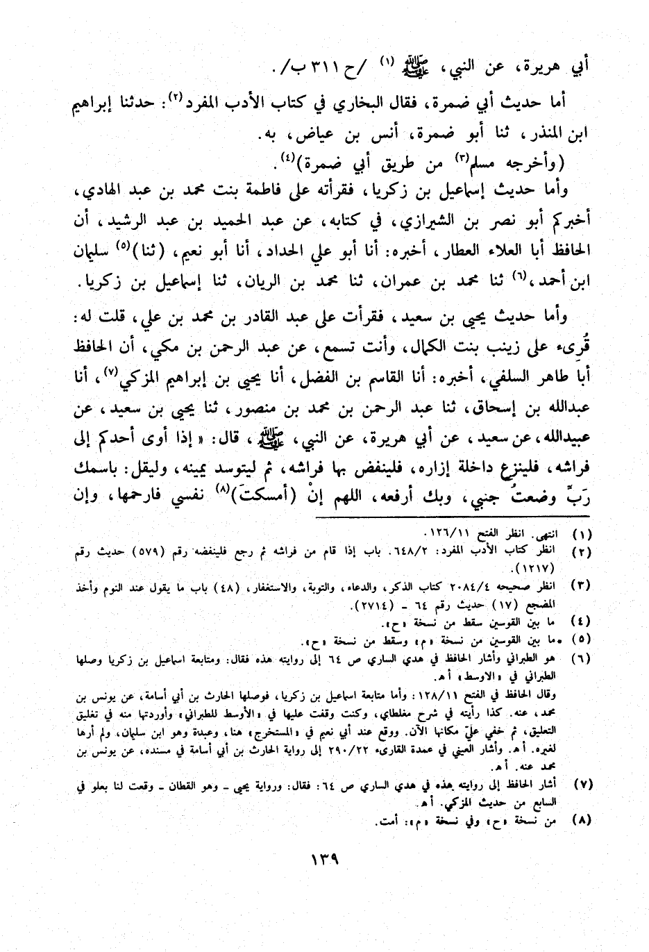 وَأما حَدِيث يحيى بن سعيد فَقَرَأْتُ عَلَى عَبْدُ الْقَادِرِ بْنُ مُحَمَّدِ بْنِ عَلِيٍّ قُلْتُ لَهُ قُرِئَ عَلَى زينت بِنْتِ الْكَمَالِ وَأَنْتَ تَسْمَعُ عَنْ عبد الرَّحْمَن بن مكي أَنا الْحَافِظَ أَبَا طَاهِرٍ السِّلَفِيَّ أَخْبَرَهُ أَنا الْقَاسِم بن الْفضل أَنا يحيى بن إِبْرَاهِيم الْمُزَكي أَنا عَبْدُ اللَّهِ بْنُ إِسْحَاقَ ثَنَا عَبْدُ الرَّحْمَنِ بْنُ مُحَمَّدِ بْنِ مَنْصُورٍ ثَنَا يَحْيَى بْنُ سَعِيدٍ عَن عبيد الله عَن سعيد عَن أبي هُرَيْرَة عَن النَّبِي صلى الله عَلَيْهِ وَسَلَّمَ قَالَ إِذَا أَوَى أَحَدُكُمْ إِلَى فِرَاشِهِ فَلْيَنْزِعْ دَاخِلَةَ إِزَارِهِ فَلْيَنْفُضْ بِهَا فِرَاشَهُ ثُمَّ لِيَتَوَسَّدْ يَمِينَهُ وَلْيَقُلْ بِاسْمِكَ رَبِّ وَضَعْتُ جَنْبِي وَبِكَ أَرْفَعُهُ اللَّهُمَّ إِنْ أَمْسَكت نَفسِي فارحمها وَإِن