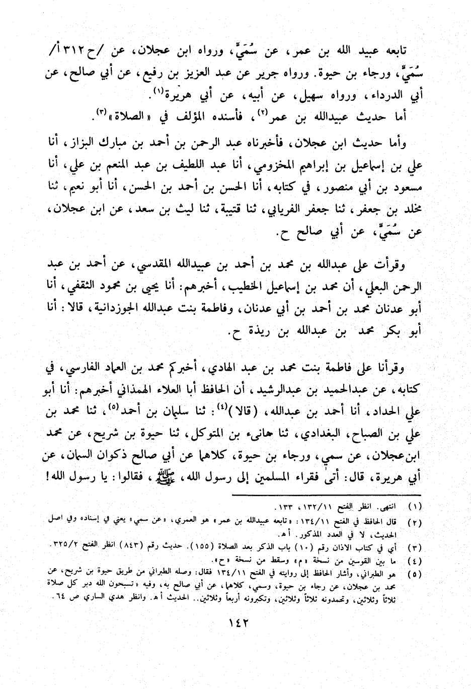وَقَرَأْنَا عَلَى فَاطِمَةَ بِنْتِ مُحَمَّد بن عبد الْهَادِي أخْبركُم مُحَمَّدُ بْنُ الْعِمَادِ الْفَارِسِيُّ فِي كِتَابِهِ عَنْ عَبْدِ الْحَمِيدِ بْنِ عَبْدِ الرَّشِيدِ أَنَّ الْحَافِظَ أَبَا الْعَلَاء الهمذاني أَخْبَرَهُمْ أَنا أَبُو عَلِيٍّ الْحَدَّادُ أَنا أَحْمد بن عبد الله قَالا ثَنَا سُلَيْمَانُ بْنُ أَحْمَدَ ثَنَا مُحَمَّد بن عَليّ بن الصَّبَّاحِ الْبَغْدَادِيُّ ثَنَا هَانِئُ بْنُ الْمُتَوَكِّلِ ثَنَا حَيْوَةُ بْنُ شُرَيْحٍ عَن مُحَمَّد ابْن عجلَان عَن سمي ورجاء بْنِ حَيْوَةَ كِلاهُمَا عَنْ أَبِي صَالِحٍ ذَكْوَانَ السَّمَّانِ عَنْ أَبِي هُرَيْرَةَ قَالَ أَتَى فُقَرَاءُ الْمُسْلِمِينَ إِلَى رَسُول الله صلى الله عَلَيْهِ وَسَلَّمَ فَقَالُوا يَا رَسُولَ الله