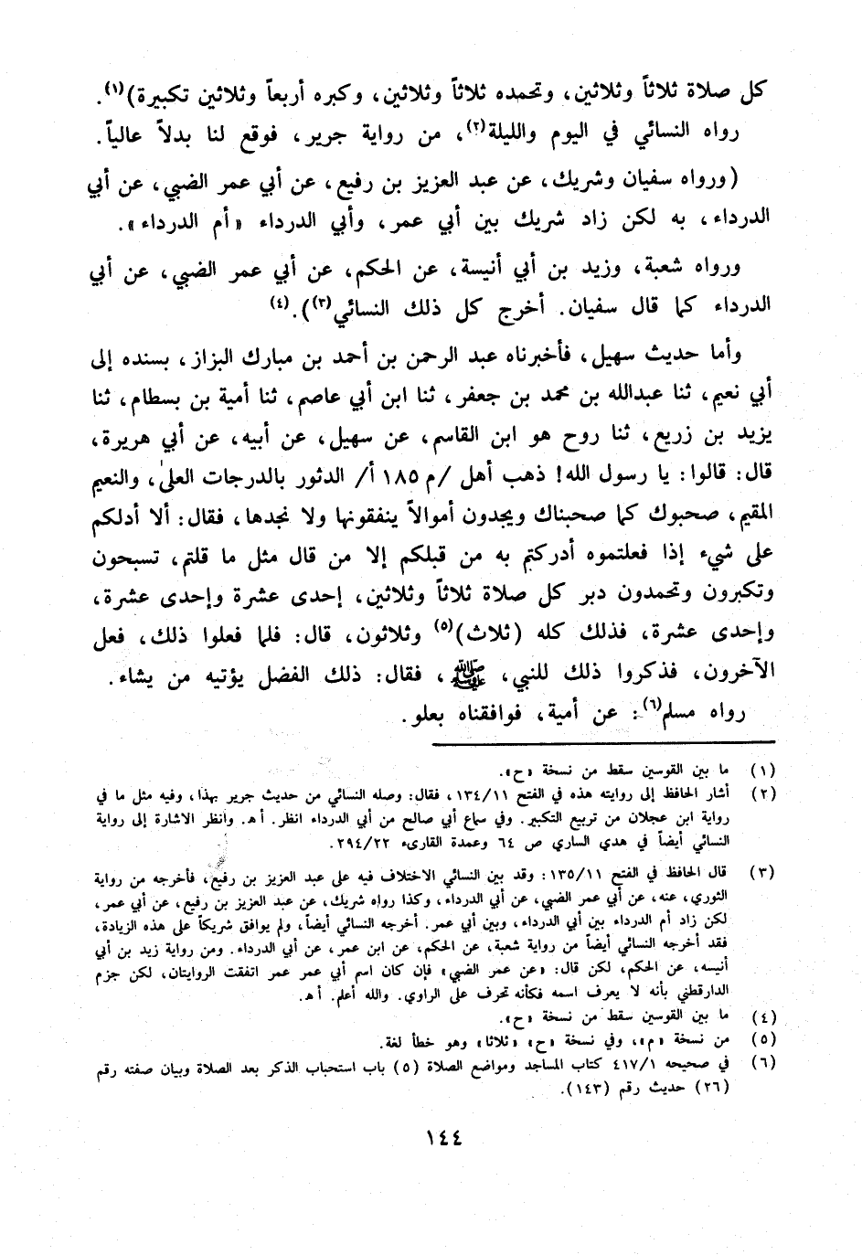 وَأما حَدِيث سُهَيْل فَأَخْبَرَنَاهُ عَبْدُ الرَّحْمَنِ بْنِ أَحْمَدَ بْنِ مُبَارَكٍ الْبَزَّازُ بِسَنَدِهِ إِلَى أَبِي نُعَيْمٍ ثَنَا عبد الله بن مُحَمَّد بْنِ جَعْفَرٍ ثَنَا ابْنُ أَبِي عَاصِمٍ ثَنَا أُمَيَّةُ بْنُ بِسْطَامٍ ثَنَا يَزِيدُ بْنُ زُرَيْعٍ ثَنَا رَوْحٌ هُوَ ابْنُ الْقَاسِمِ عَنْ سُهَيْل عَن أَبِيه عَن أبي هُرَيْرَةَ قَالَ قَالُوا يَا رَسُولَ الله ذهب أهل م 185 أالدُّثُور بالدرجات العلى وَالنَّعِيمِ الْمُقِيمِ صَحِبُوكَ كَمَا صَحِبْنَاكَ وَيَجِدُونَ أَمْوَالا يُنْفِقُونَهَا وَلا نَجِدُهَا فَقَالَ أَلا أَدُلُّكُمْ عَلَى شَيْءٍ إِذا فعلتمون أَدْرَكْتُمْ بِهِ مَنْ قَبْلَكُمْ إِلا مَنْ قَالَ مِثْلَ مَا قُلْتُمْ تُسَبِّحُونَ وَتُكَبِّرُونَ وَتَحْمَدُونَ دُبُرَ كَلِّ صَلاةٍ ثَلاثًا وَثَلاثِينَ إِحْدَى عَشْرَةَ وَإِحْدَى عَشْرَةَ وَإِحْدَى عَشْرَةَ فَذَلِكَ كُلُّهُ ثَلاثٌ وَثَلاثُونَ قَالَ فَلَمَّا فَعَلُوا ذَلِكَ فَعَلَ الآخَرُونَ فَذَكَرُوا ذَلِك للنَّبِي صلى الله عَلَيْهِ وَسَلَّمَ فَقَالَ ذَلِكَ الْفَضْلُ يُؤْتِيهِ مَنْ يَشَاءُ