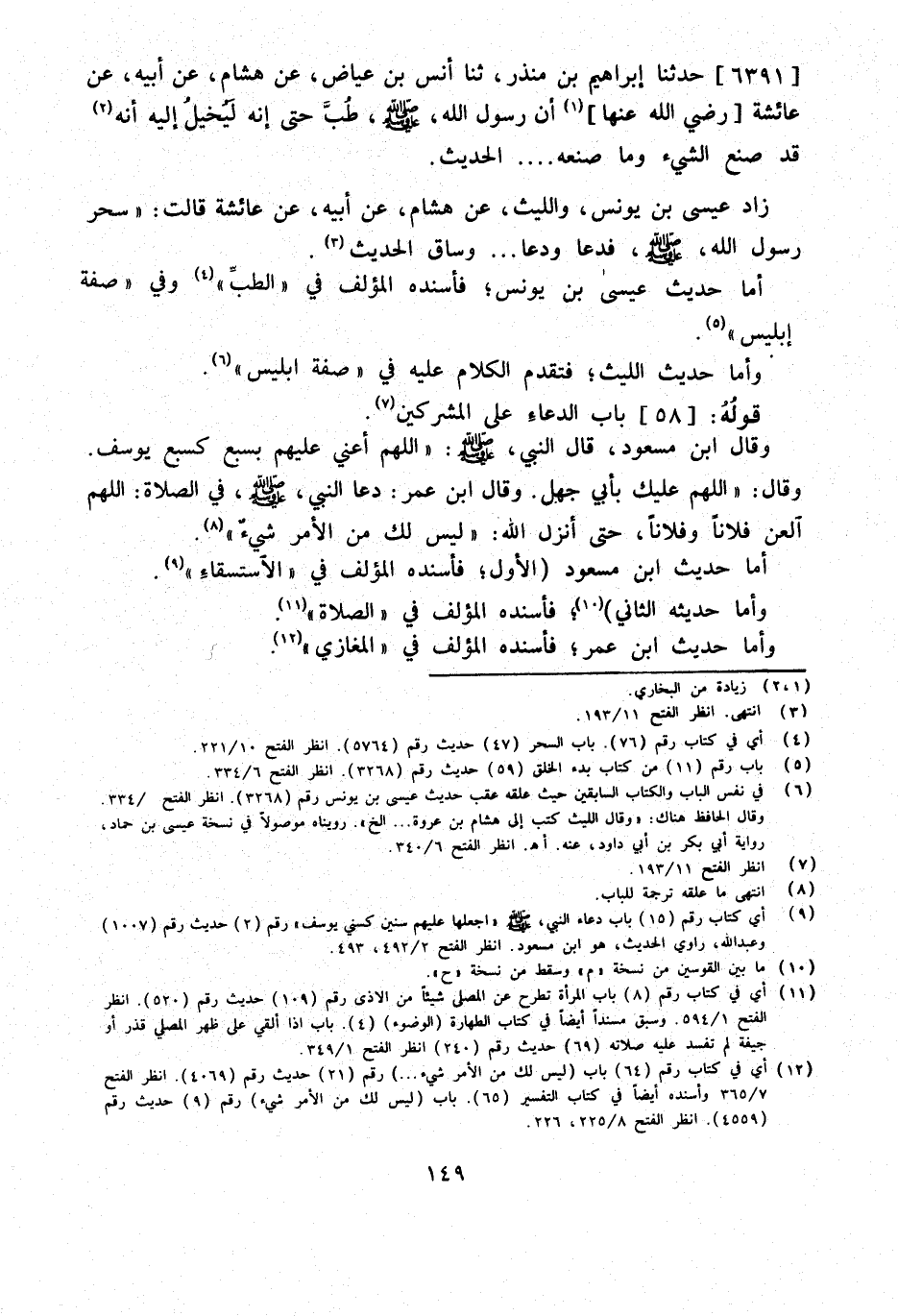 6391 - حَدَّثَنَا إِبْرَاهِيمُ بْنُ مُنْذِرٍ ثَنَا أَنَسِ بْنِ عِيَاضٍ عَنْ هِشَامٍ عَنْ أَبِيهِ عَنْ عَائِشَةَ رَضِيَ اللَّهُ عَنْهَا أَنَّ رَسُولَ اللَّهِ صَلَّى اللَّهُ عَلَيْهِ وَسَلَّمَ طُبَّ حَتَّى إِنَّهُ لَيُخَيَّلُ إِلَيْهِ أَنَّهُ قَدْ صَنَعَ الشَّيْءَ وَمَا صَنَعَهُ الْحَدِيثَ