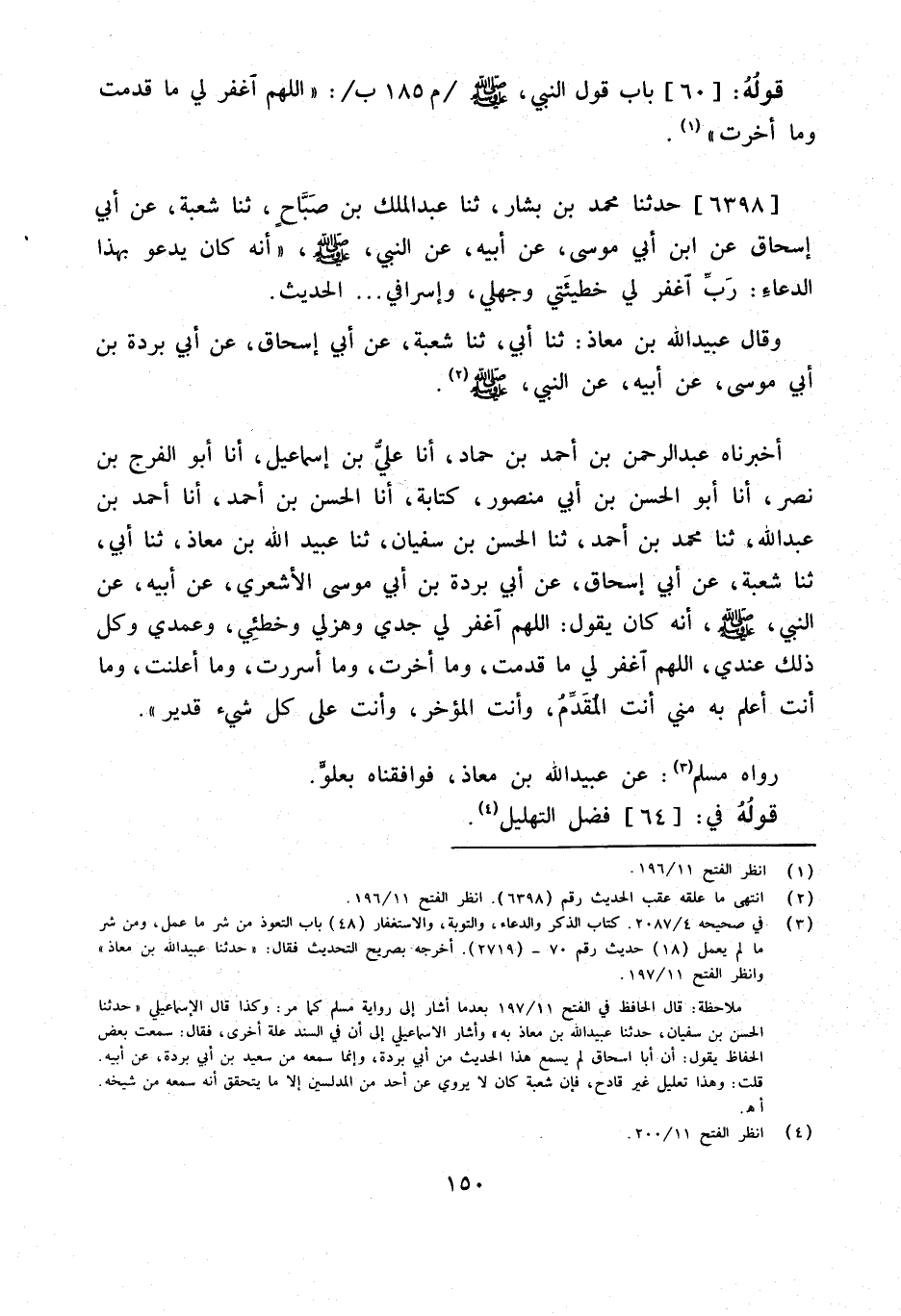 أَخْبَرَنَاهُ عَبْدُ الرَّحْمَنِ بْنُ أَحْمَدَ بْنِ حَمَّادٍ أَنا عَلِيُّ بْنُ إِسْمَاعِيلَ أَنا أَبُو الْفرج بن نصر أَنا أَبُو الْحَسَنِ بْنُ أَبِي مَنْصُورٍ كِتَابه أَنا الْحسن بن أَحْمد أَنا أَحْمد بن عبد الله ثَنَا مُحَمَّدُ بْنُ أَحْمَدَ ثَنَا الْحسن بن سُفْيَان ثَنَا عبيد الله بْنُ مُعَاذٍ ثَنَا أَبِي ثَنَا شُعْبَةُ عَنْ أَبِي إِسْحَاقَ عَنْ أبي بردة بن أبي مُوسَى الأَشْعَرِيِّ عَنْ أَبِيهِ عَنِ النَّبِيِّ صَلَّى اللَّهُ عَلَيْهِ وَسَلَّمَ أَنَّهُ كَانَ يَقُولُ اللَّهُمَّ اغْفِرْ لِي جِدِّي وَهَزْلِي وَخَطَئِي وَعَمْدِي وَكُلَّ ذَلِكَ عِنْدِي اللَّهُمَّ اغْفِرْ لِي مَا قَدَّمْتُ وَمَا أَخَّرْتُ وَمَا أَسْرَرْتُ وَمَا أَعْلَنْتُ وَمَا أَنْتَ أَعْلَمُ بِهِ مِنِّي أَنْتَ الْمُقَدِّمُ وَأَنْتَ الْمُؤَخِّرُ وَأَنْتَ عَلَى كُلِّ شَيْءٍ قَدِيرٌ
