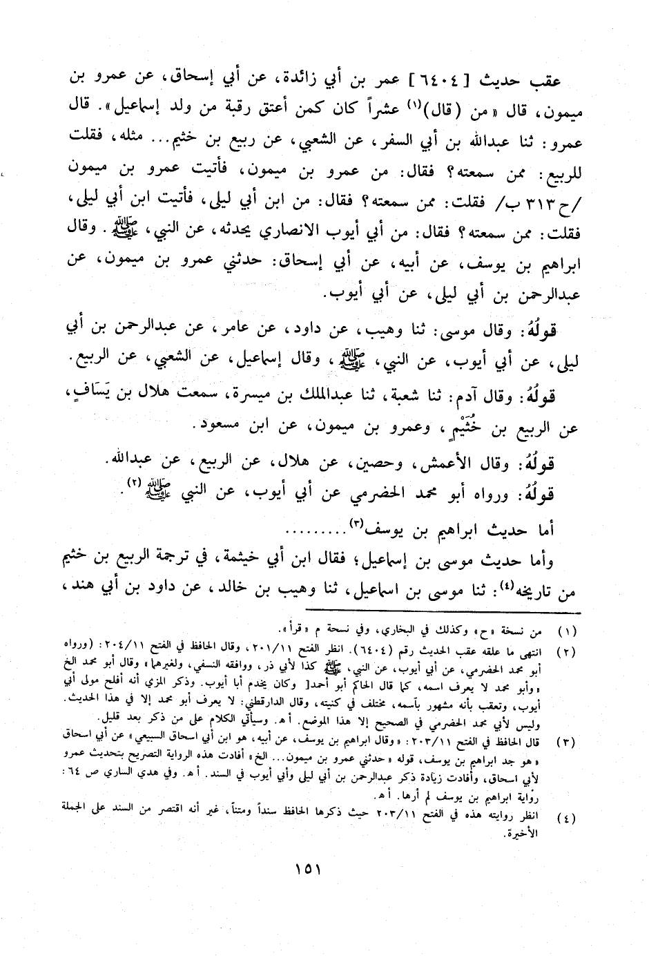 عَقِبَ حَدِيثِ 6404 عُمَرَ بْنِ أَبِي زَائِدَةَ عَنْ أَبِي إِسْحَاقَ عَنْ عَمْرِو بْنِ مَيْمُونٍ قَالَ مَنْ قَالَ عَشْرًا كَانَ كَمَنْ أَعْتَقَ رَقَبَةً مِنْ وَلَدِ إِسْمَاعِيلَ قَالَ عَمْرو ثَنَا عبد الله بن أبي السّفر عَن الشّعبِيّ عَن ربيع بن خثيم مثله فَقلت للربيع مِمَّن سمعته فَقَالَ من عَمْرو بن مَيْمُون فَأتيت عَمْرو بن مَيْمُون ح 313 ب فَقلت مِمَّن سمعته فَقَالَ من ابْن أبي ليلى فَأتيت ابْن أبي ليلى فَقلت مِمَّن سمعته فَقَالَ من أبي أَيُّوب الْأنْصَارِيّ يحدثه عَن النَّبِي صلى الله عَلَيْهِ وَسَلَّمَ وَقَالَ إِبْرَاهِيم بن يُوسُف عَن أَبِيه عَن أبي إِسْحَاق حَدثنِي عَمْرو بن مَيْمُون عَن عبد الرَّحْمَن بن أبي ليلى عَن أبي أَيُّوب