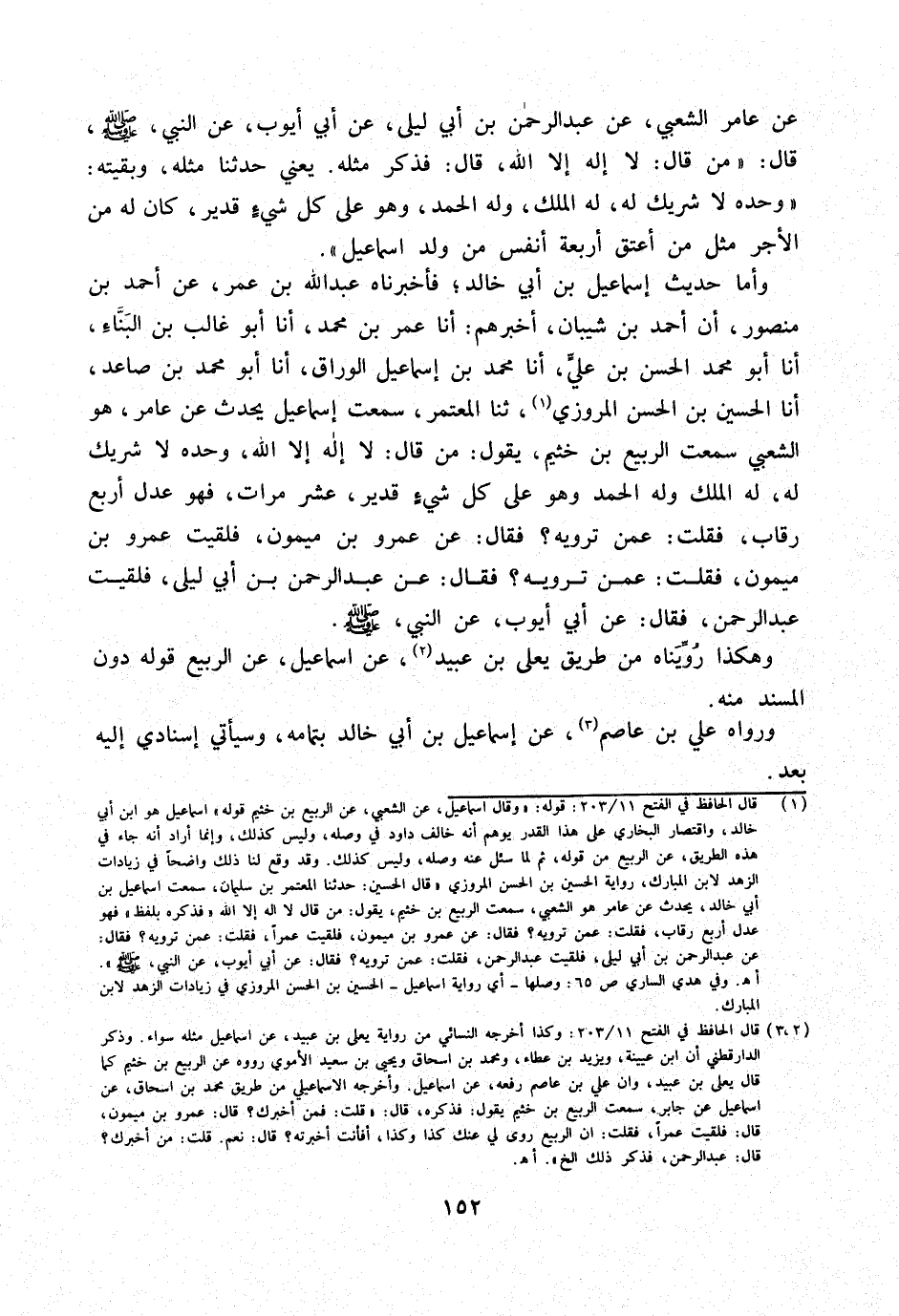وَأما حَدِيث إِسْمَاعِيل بن أبي خَالِد فَأَخْبَرَنَاهُ عَبْدُ اللَّهِ بْنُ عُمَرَ عَنْ أَحْمَدَ بن مَنْصُور أَن أَحْمد بن شَيبَان أخْبرهُم أَنا عُمَرُ بْنُ مُحَمَّدٍ أَنا أَبُو غَالب بن الْبناء أَنا أَبُو مُحَمَّدٍ الْحَسَنُ بْنُ عَلِيٍّ أَنا مُحَمَّد بن إِسْمَاعِيل الْوراق أَنا أَبُو مُحَمَّدِ بْنُ صَاعِدٍ أَنا الْحُسَيْنُ بْنُ الْحَسَنِ الْمَرْوَزِيُّ ثَنَا الْمُعْتَمِرُ سَمِعْتُ إِسْمَاعِيلَ يُحَدِّثُ عَنْ عَامِرٍ هُوَ الشَّعْبِيُّ سَمِعْتُ الرَّبِيعَ بْنَ خُثَيْمٍ يَقُولُ مَنْ قَالَ لَا إِلَهَ إِلا اللَّهُ وَحده لَا شريك لَهُ لَهُ الْملك وَله الْحَمد وَهُوَ على كُلِّ شَيْءٍ قَدِيرٌ عَشْرَ مَرَّاتٍ فَهُوَ عَدْلُ أَرْبَعِ رِقَابٍ فَقلت عَمَّن ترويه فَقَالَ عَن عَمْرو بن مَيْمُون فَلَقِيت عَمْرو بن مَيْمُون فَقلت عَمَّن ترويه فَقَالَ عَن عبد الرَّحْمَن بن أبي ليلى فَلَقِيت عبد الرَّحْمَن فَقَالَ عَن أبي أَيُّوب عَن النَّبِي صلى الله عَلَيْهِ وَسَلَّمَ