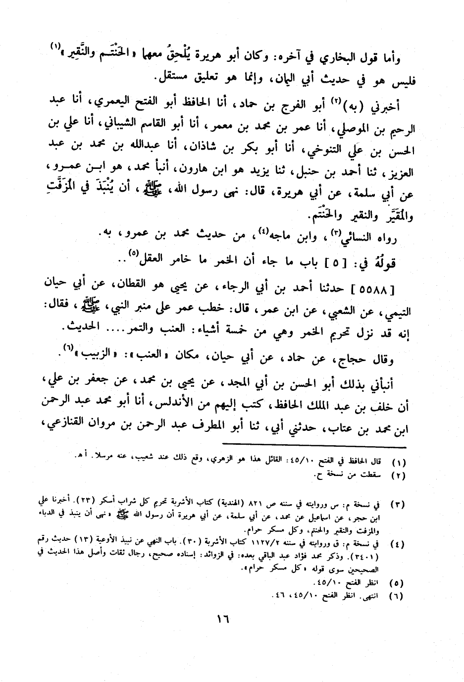 أَخْبَرَنِي بِهِ أَبُو الْفَرَجِ بْنُ حَمَّادٍ أَنا الْحَافِظُ أَبُو الْفَتْحِ الْيَعْمُرِيُّ أَنا عَبْدُ الرَّحِيمِ بْنُ الْمَوْصِلِيِّ أَنا عُمَرُ بْنُ مُحَمَّدِ بْنِ مَعْمَرٍ أَنا أَبُو الْقَاسِمِ الشَّيْبَانِيُّ أَنا عَلِيُّ بْنُ الْحَسَنِ بْنِ عَلِيٍّ التَّنُوخِيُّ أَنا أَبُو بكر بن شَاذان أَنا عَبْدُ اللَّهِ بْنُ مُحَمَّدٍ بن عبد الْعَزِيز ثَنَا أَحْمد بْنُ حَنْبَلٍ ثَنَا يَزِيدُ هُوَ ابْنُ هَارُونَ أنبأ مُحَمَّدٌ هُوَ ابْنُ عَمْرٍو عَنْ أَبِي سَلَمَةَ عَنْ أَبِي هُرَيْرَةَ قَالَ نَهَى رَسُول الله صلى الله عَلَيْهِ وَسَلَّمَ أَنْ يُنْبَذَ فِي الْمُزَفَّتِ وَالْمُقَيَّرِ وَالنَّقِيرِ وَالْحَنْتَمِ