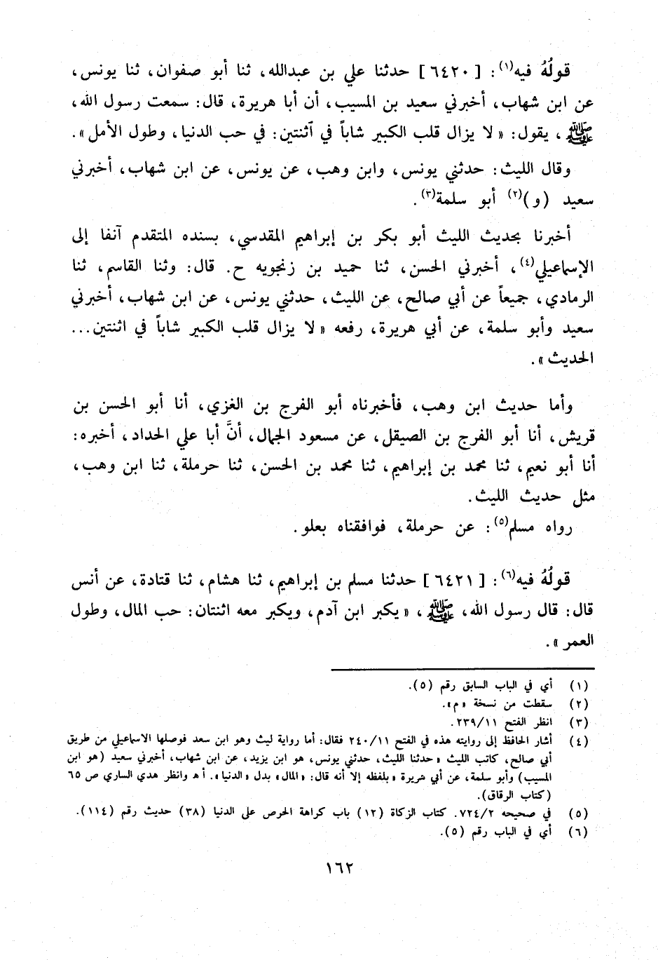 أَخْبَرَنَا بِحَدِيثِ اللَّيْثِ أَبُو بكر بن إِبْرَاهِيم الْمَقْدِسِي بِسَنَدِهِ الْمُتَقَدِّمِ آنِفًا إِلَى الإِسْمَاعِيلِيِّ أَخْبَرَنِي الْحَسَنُ ثَنَا حُمَيْدُ بْنُ زَنْجُوَيْهِ ح قَالَ وَثنا الْقَاسِمُ ثَنَا الرَّمَادِيُّ جَمِيعًا عَنْ أَبِي صَالِحٍ عَنِ اللَّيْثِ حَدَّثَنِي يُونُسُ عَنِ ابْن شهَاب أَخْبرنِي سعيد وَأَبُو سَلَمَةَ عَنْ أَبِي هُرَيْرَةَ رَفَعَهُ لَا يَزَالُ قَلْبُ الْكَبِيرِ شَابًّا فِي اثْنَتَيْنِ الْحَدِيثَ