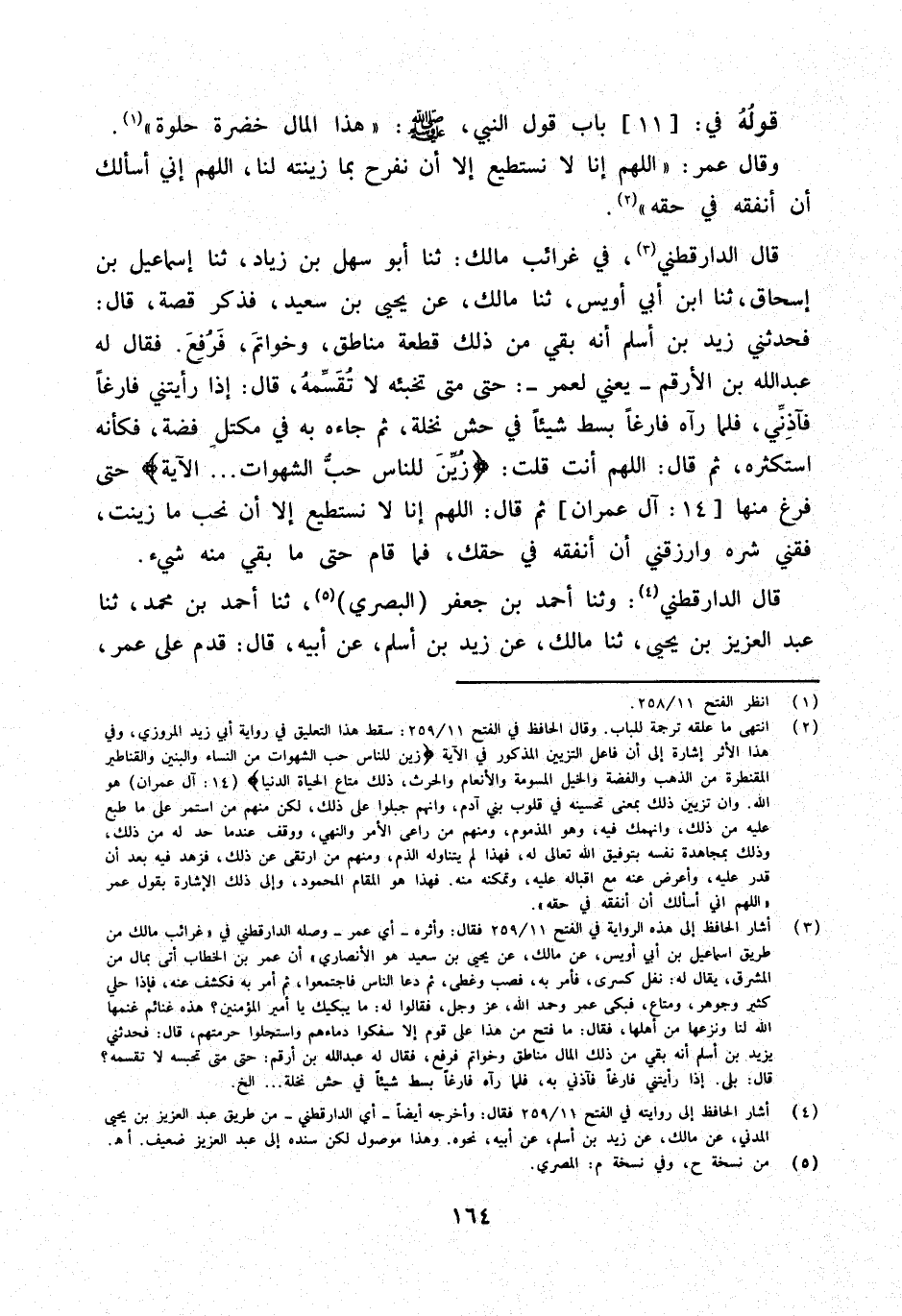قَالَ الدَّارَقُطْنِيّ فِي غرائب مَالك ثَنَا أَبُو سهل بن زِيَاد ثَنَا إِسْمَاعِيل بن إِسْحَاق ثَنَا ابْن أبي أويس ثَنَا مَالك عَن يحيى بن سعد فَذكر قصَّة قَالَ فَحَدثني زيد بن أسلم أَنه بَقِي من ذَلِك قِطْعَة مناطق وخواتم فَرفع فَقَالَ لَهُ عَبْدُ اللَّهِ بْنُ الأرقم يَعْنِي لعمر حَتَّى مَتى تخبئه لَا تقسمه قَالَ إِذا رَأَيْتنِي فَارغًا فَآذِنِّي فَلَمَّا رَآهُ فَارغًا بسط شَيْئا فِي حش نَخْلَة ثمَّ جَاءَهُ بِهِ فِي مكتل فضَّة فَكَأَنَّهُ استكثره ثمَّ قَالَ اللَّهُمَّ أَنْت قلت {زُيِّنَ للنَّاس حب الشَّهَوَات} الْآيَة حَتَّى فرغ مِنْهَا 14 آل عمرَان ثمَّ قَالَ اللَّهُمَّ إِنَّا لَا نستطيع إِلَّا أَن نحب مَا زينت فقني شَره وارزقني أَن أنفقهُ فِي حَقك فَمَا قَامَ حَتَّى مَا بَقِي مِنْهُ شَيْء