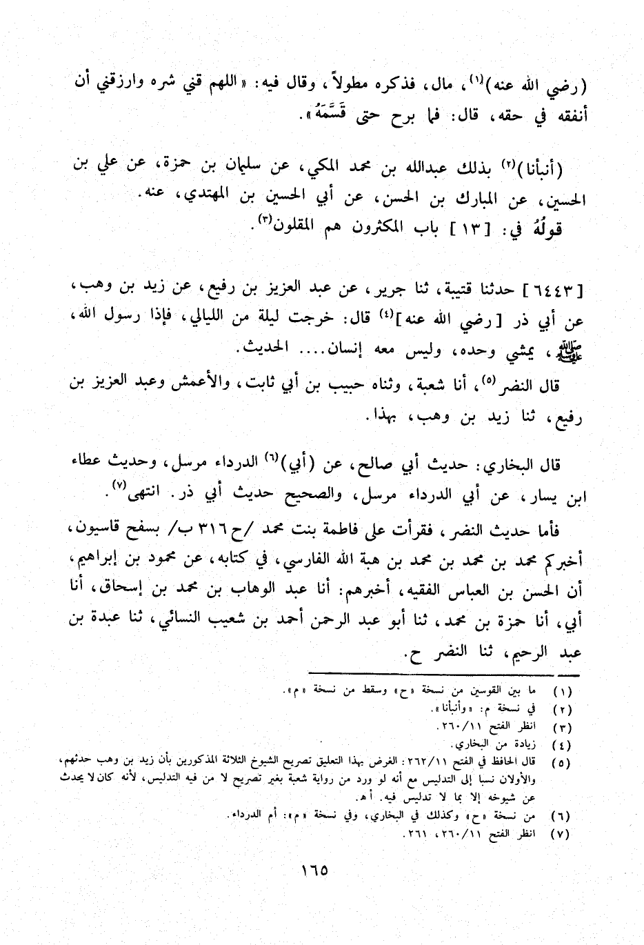 فَأَما حَدِيث النَّضر فَقَرَأْتُ عَلَى فَاطِمَة بنت مُحَمَّد ح 316 ب بِسَفْحِ قَاسِيُونَ أَخْبَرَكُمْ مُحَمَّدُ بْنُ مُحَمَّدِ بْنِ مُحَمَّدِ بْنِ هِبَةِ اللَّهِ الْفَارِسِيُّ فِي كِتَابِهِ عَنْ مَحْمُودِ بْنِ إِبْرَاهِيمَ أَنَّ الْحَسَنَ بْنَ الْعَبَّاسِ الْفَقِيهَ أَخْبَرَهُمْ أَنا عبد الْوَهَّاب بن مُحَمَّد بن إِسْحَاقَ أَنا أَبِي أَنا حَمْزَةُ بْنُ مُحَمَّدٍ ثَنَا أَبُو عَبْدِ الرَّحْمَن أَحْمد بن شُعَيْب النَّسَائِيّ ثَنَا عَبْدَةُ بْنُ عَبْدِ الرَّحِيمِ ثَنَا النَّضر ح
