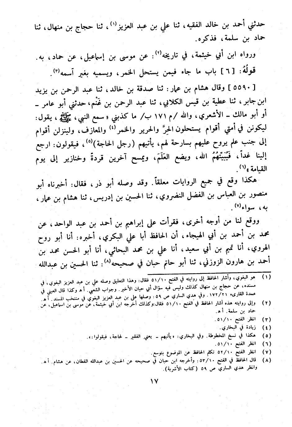 5590 - وَقَالَ هِشَام بن عَمَّارٍ ثَنَا صَدَقَةُ بْنُ خَالِدٍ ثَنَا عَبْدُ الرَّحَمْنِ بْنُ يَزِيدَ ابْن جَابِرٍ ثَنَا عَطِيَّةُ بْنُ قَيْسٍ الْكِلابِيُّ ثَنَا عَبْدُ الرَّحْمَنِ بْنُ غَنْمٍ حَدَّثَنِي أَبُو عَامِرٍ أَوْ أَبُو مَالك الْأَشْعَرِيّ وَالله م 171 ب مَا كَذَبَنِي سَمِعَ النَّبِيَّ صَلَّى اللَّهُ عَلَيْهِ وَسَلَّمَ يَقُولُ لَيَكُونَنَّ فِي أُمَّتِي أَقْوَامٌ يَسْتَحِلُّونَ الْحِرَّ وَالْحَرِيرَ وَالْخَمْرَ وَالْمَعَازِفَ وَلَيَنْزِلَنَّ أَقْوَامٌ إِلَى جَنْبِ عَلَمٍ يَرُوحُ عَلَيْهِمْ بِسَارِحَةٍ لَهُمْ يَأْتِيهِمْ رَجُلُ الْحَاجَةِ فَيَقُولُونَ ارْجِعْ إِلَيْنَا غَدًا فَيُبَيِّتُهُمُ الله وَيَضَع الْعلم وَيمْسَح آخَرِينَ قِرَدَةً وَخَنَازِيرَ إِلَى يَوْمِ الْقِيَامَةِ