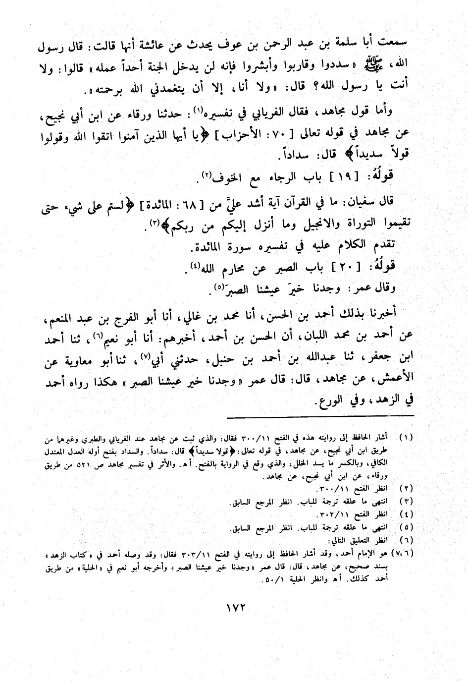 وَأما قَول مُجَاهِد فَقَالَ الْفرْيَابِيّ فِي تَفْسِيره حَدثنَا وَرْقَاء عَن ابْن أبي نجيح عَن مُجَاهِد فِي قَوْله تَعَالَى 70 الْأَحْزَاب {يَا أَيهَا الَّذِينَ آمَنُوا اتَّقُوا اللَّهَ وَقُولُوا قولا سديدا} قَالَ سدادا