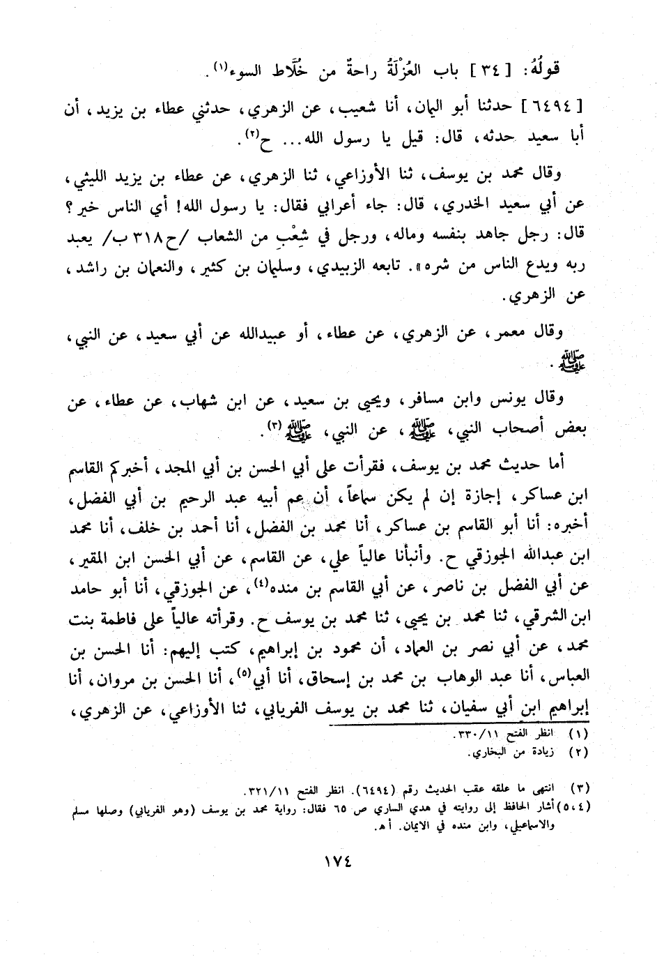 وَقَالَ مُحَمَّدُ بْنُ يُوسُفَ ثَنَا الأَوْزَاعِيُّ ثَنَا الزُّهْرِيُّ عَنْ عَطَاءِ بْنِ يَزِيدَ اللَّيْثِيِّ عَنْ أَبِي سَعِيدٍ الْخُدْرِيِّ قَالَ جَاءَ أَعْرَابِيٌّ فَقَالَ يَا رَسُولَ اللَّهِ أَيُّ النَّاسِ خَيْرٌ قَالَ رَجُلٌ جَاهَدَ بِنَفْسِهِ وَمَالِهِ وَرَجُلٌ فِي شِعْبٍ مِنَ الشِّعَابِ ح 318 ب يَعْبُدُ رَبَّهُ وَيَدَعُ النَّاسُ مِنْ شَرِّهِ تَابعه الزبيدِيّ وَسليمَان بن كثير والنعمان بن رَاشد عَن الزُّهْرِيّ