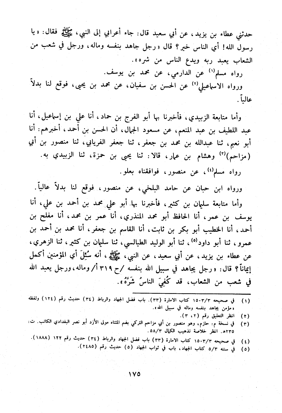 وَأما مُتَابعَة سُلَيْمَان بن كثير فَأَخْبَرَنَا بِهَا أَبُو عَلِيٍّ مُحَمَّدُ بْنُ أَحْمَدَ بْنِ عَلِيٍّ أَنا يُوسُفُ بْنُ عُمَرَ أَنا الْحَافِظُ أَبُو مُحَمَّدٍ الْمُنْذِرِيُّ أَنا عُمَرُ بْنُ مُحَمَّدٍ أَنا مُفْلِحُ بْنُ أَحْمَدَ أَنا الْخَطِيبُ أَبُو بَكْرِ بْنِ ثَابِتٍ أَنا الْقَاسِمُ بْنُ جَعْفَرٍ أَنا مُحَمَّدُ بْنُ أَحْمَدَ بن عَمْرو ثَنَا أَبُو دَاوُد ثَنَا أَبُو الْوَلِيدِ الطَّيَالِسِيُّ ثَنَا سُلَيْمَانُ بْنُ كَثِيرٍ ثَنَا الزُّهْرِيُّ عَنْ عَطَاءِ بْنِ يَزِيدَ عَنْ أبي سعيد عَن النَّبِي صلى اللَّهُ عَلَيْهِ وَسَلَّمَ أَنَّهُ سُئِلَ أَيُّ الْمُؤْمِنِينَ أَكْمَلُ إِيمَانًا قَالَ رَجُلٌ يُجَاهِدُ فِي سَبِيلِ اللَّهِ بِنَفسِهِ ح 319 أوَمَالِهِ وَرَجُلٌ يَعْبُدُ اللَّهَ فِي شِعْبٍ مِنَ الشِّعَابِ قَدْ كُفِيَ النَّاس شَره