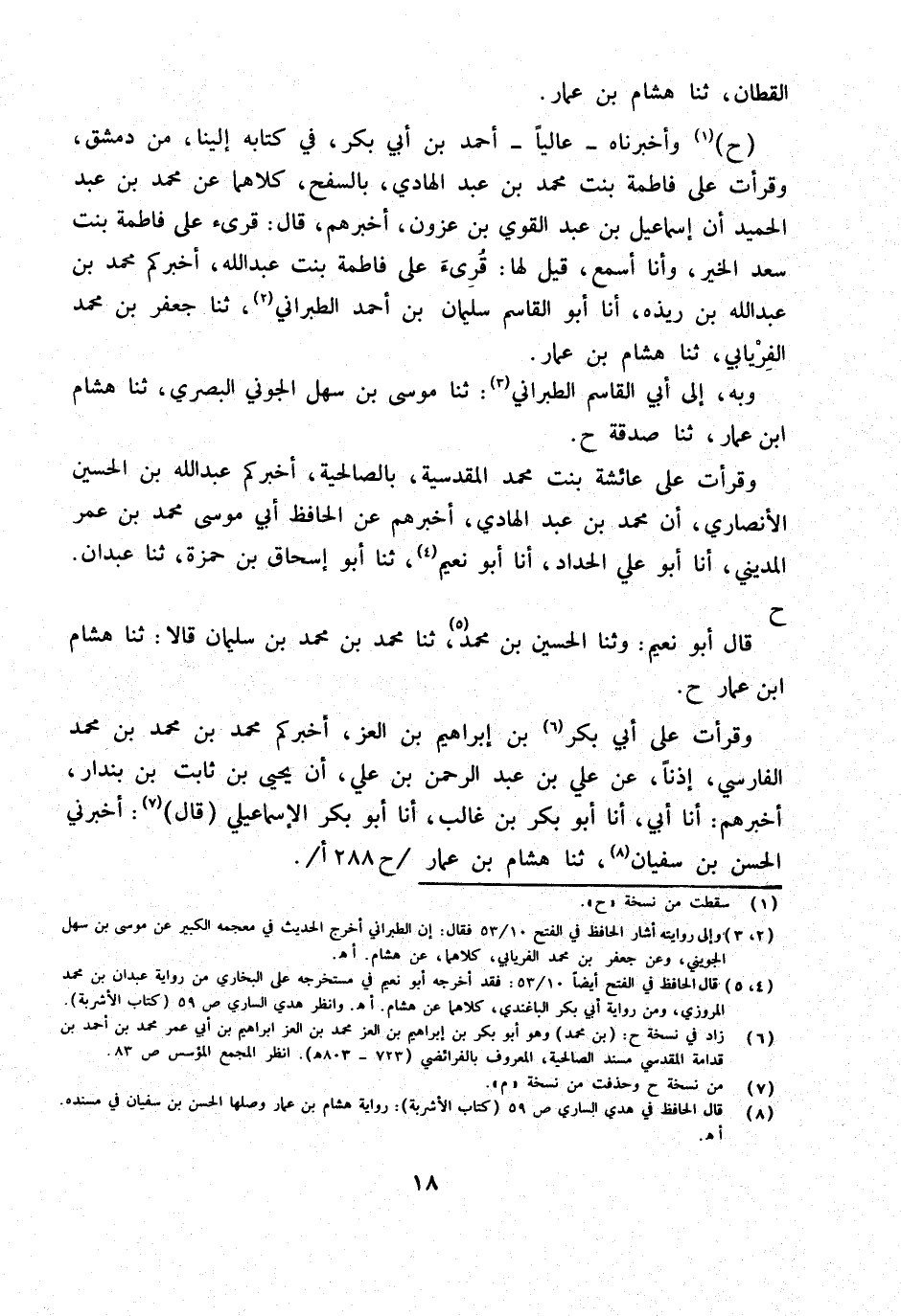 ح وَأَخْبَرَنَاهُ عَالِيًا أَحْمَدُ بْنُ أَبِي بَكْرٍ فِي كِتَابِهِ إِلَيْنَا مِنْ دِمَشْقَ وَقَرَأْتُ عَلَى فَاطِمَةَ بِنْتِ مُحَمَّدِ بْنِ عَبْدِ الْهَادِي بِالسَّفْحِ كِلاهُمَا عَنْ مُحَمَّدِ بْنِ عَبْدِ الْحَمِيدِ أَنَّ إِسْمَاعِيلَ بْنَ عبد الْقوي بن عزون أخْبرهُم قَالَ قرئَ على فَاطِمَة بنت سعدالخير وَأَنَا أَسْمَعُ قِيلَ لَهَا قُرِئَ على فَاطِمَة بنت عبد الله أخْبركُم مُحَمَّد بن عبد الله بن ريذه أَنا أَبُو الْقَاسِم سُلَيْمَان بن أَحْمد الطَّبَرَانِيّ ثَنَا جَعْفَر بن مُحَمَّد الْفرْيَابِيّ ثَنَا هِشَامُ بْنُ عَمَّارٍ