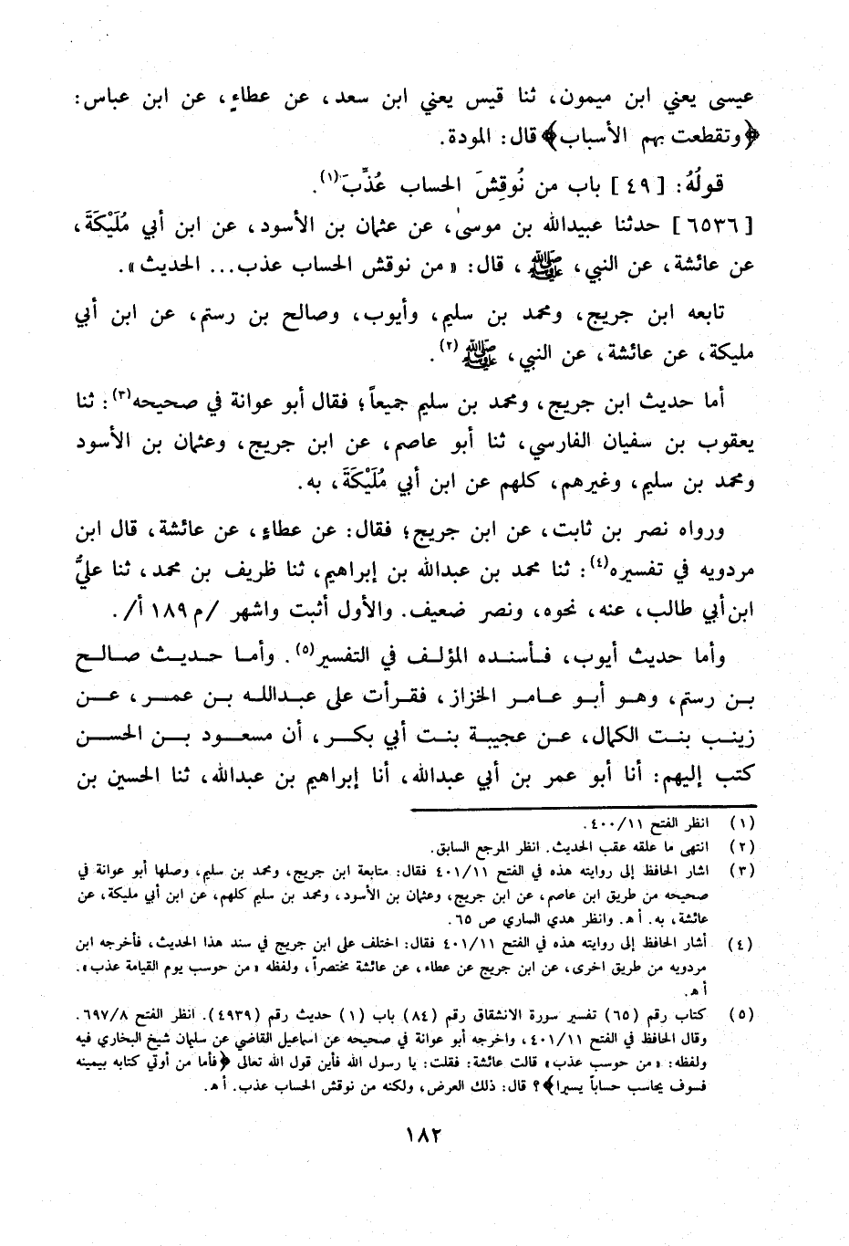 6536 - حَدثنَا عبيد الله بْنُ مُوسَى عَنْ عُثْمَانَ بْنِ الأَسْوَدِ عَنِ ابْنِ أَبِي مُلَيْكَةَ عَن عَائِشَة عَن النَّبِي صلى الله عَلَيْهِ وَسلم قَالَ من نُوقِشَ الْحِسَابَ عُذِّبَ الْحَدِيثَ
