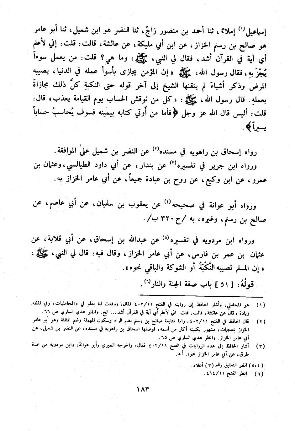 إِسْمَاعِيلَ إِمْلاءً ثَنَا أَحْمَدُ بْنُ مَنْصُورٍ زَاجٌ ثَنَا النَّضْرُ هُوَ ابْنُ شُمَيْلٍ ثَنَا أَبُو عَامِرٍ هُوَ صَالِحُ بْنُ رُسْتُمَ الْخَزَّازُ عَن ابْن أبي مليكَة عَن عَائِشَةَ قَالَتْ قُلْتُ إِنِّي لأَعْلَمُ أَيَّ آيَةٍ فِي الْقُرْآنِ أَشَدَّ فَقَالَ لي النَّبِي صلى الله عَلَيْهِ وَسَلَّمَ وَمَا هِيَ قُلْتُ مَنْ يَعْمَلْ سُوءًا يُجْزَ بِهِ فَقَالَ رَسُول الله صلى الله عَلَيْهِ وَسَلَّمَ إِنَّ الْمُؤْمِنَ يُجَازَى بِأَسْوَأِ عَمَلِهِ فِي الدُّنْيَا يُصِيبُهُ الْمَرَضُ وَذَكَرَ أَشْيَاءَ لَمْ يُتْقِنْهَا الشَّيْخُ إِلَى آخِرِ قَوْله حَتَّى النَّكْبَةَ كُلُّ ذَلِكَ مُجَازَاةً بِعَمَلِهِ قَالَ رَسُول الله صلى الله عَلَيْهِ وَسَلَّمَ كُلُّ مَنْ نُوقِشَ الْحِسَابَ يَوْمَ الْقِيَامَةِ يُعَذَّبُ قَالَ قُلْتُ أَلَيْسَ قَالَ اللَّهُ عَزَّ وَجَلَّ {فَأَمَّا مَنْ أُوتِيَ كِتَابَهُ بِيَمِينِهِ فَسَوْفَ يُحَاسَبُ حِسَابًا يَسِيرًا}