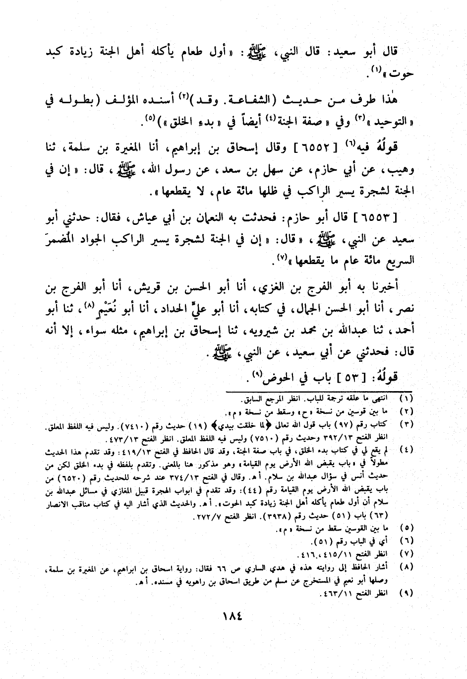6552 - وَقَالَ إِسْحَاق بن إِبْرَاهِيم أَنا الْمُغِيرَةُ بْنُ سَلَمَةَ ثَنَا وُهَيْبٌ عَنْ أَبِي حَازِمٍ عَن سهل بن سعد عَن رَسُول الله صلى الله عَلَيْهِ وَسَلَّمَ قَالَ إِنَّ فِي الْجَنَّةِ لَشَجَرَةً يَسِيرُ الرَّاكِبُ فِي ظِلِّهَا مِائَةَ عَامٍ لَا يَقْطَعُهَا