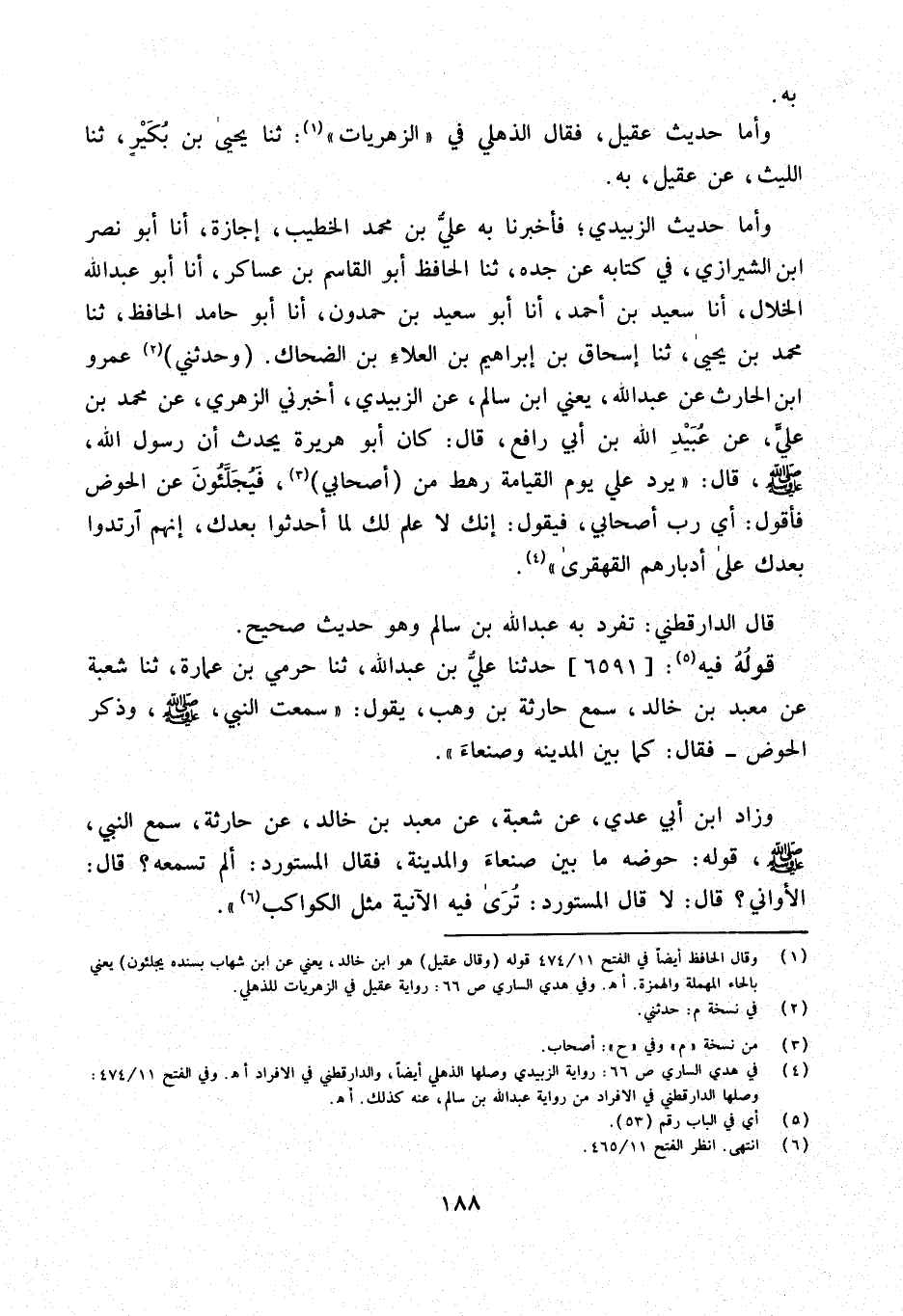 وَأما حَدِيث الزبيدِيّ فَأَخْبَرَنَا بِهِ عَلِيُّ بْنُ مُحَمَّدٍ الْخَطِيبُ إِجَازَةً أَنا أَبُو نَصْرِ ابْن الشِّيرَازِيِّ فِي كِتَابِهِ عَنْ جَدِّهِ ثَنَا الْحَافِظُ أَبُو الْقَاسِمِ بْنُ عَسَاكِرَ أَنا أَبُو عَبْدِ اللَّهِ الْخَلالُ أَنا سَعِيدُ بْنُ أَحْمَدَ أَنا أَبُو سَعِيدِ بْنُ حَمْدُونٍ أَنا أَبُو حَامِدٍ الْحَافِظُ ثَنَا مُحَمَّدُ بْنُ يَحْيَى ثَنَا إِسْحَاقُ بن إِبْرَاهِيم بن الْعَلَاء بن الضَّحَّاك وحَدثني عَمْرو ابْن الْحَارِثِ عَنْ عَبْدِ اللَّهِ يَعْنِي ابْنَ سَالِمٍ عَنِ الزُّبَيْدِيِّ أَخْبَرَنِي الزُّهْرِيّ عَن مُحَمَّد بن عَليّ عَن عبيد الله بْنِ أَبِي رَافِعٍ قَالَ كَانَ أَبُو هُرَيْرَةَ يُحَدِّثُ أَنَّ رَسُولَ الله صلى الله عَلَيْهِ وَسلم قَالَ يَرِدُ عَلَيَّ يَوْمَ الْقِيَامَةِ رَهْط من أَصْحَابِي فيجلئون عَنِ الْحَوْضِ فَأَقُولُ أَيْ رَبِّ أَصْحَابِي 2 فَيَقُولُ إِنَّكَ لَا عِلْمَ لَكَ لِمَا أَحْدَثُوا بَعْدَكَ إِنَّهُمُ ارْتَدُّوا بَعْدَكَ عَلَى أَدْبَارِهِمُ الْقَهْقَرَى