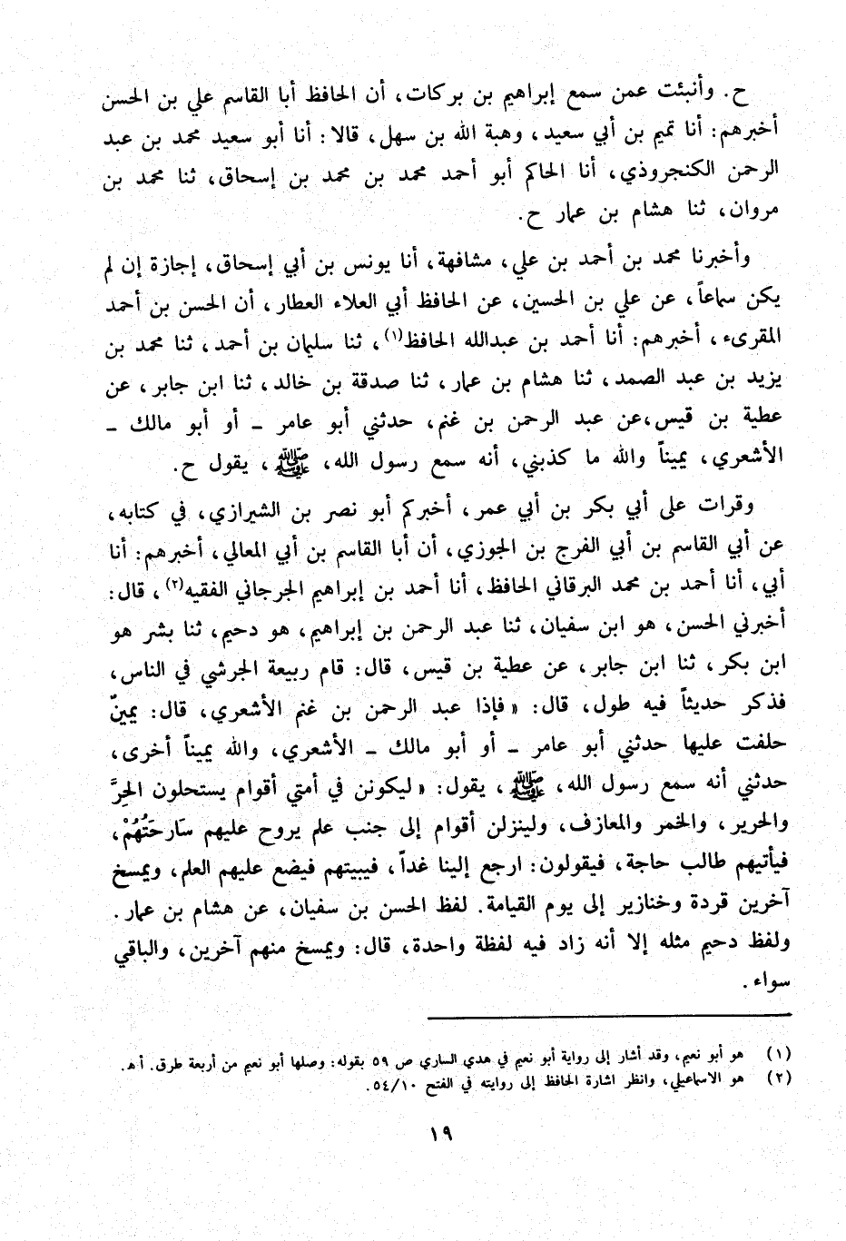 وَقَرَأْتُ على أبي بكر بن أبي عُمَرَ أَخْبَرَكُمْ أَبُو نَصْرِ بْنُ الشِّيرَازِيِّ فِي كِتَابِهِ عَنْ أَبِي الْقَاسِمِ بْنِ أَبِي الْفَرَجِ بْنِ الْجَوْزِيّ أَنا أَبَا الْقَاسِمِ بْنَ أَبِي الْمَعَالِي أَخْبَرَهُمْ أَنا أَبِي أَنا أَحْمَدُ بْنُ مُحَمَّدٍ الْبَرْقَانِيُّ الْحَافِظُ أَنا أَحْمَدُ بْنُ إِبْرَاهِيمَ الْجُرْجَانِيُّ الْفَقِيهُ قَالَ أَخْبرنِي الْحسن هُوَ ابْن سُفْيَان ثَنَا عبد الرَّحْمَن بن إِبْرَاهِيمَ هُوَ دُحَيْمٌ ثَنَا بِشْرٌ هُوَ ابْنُ بَكْرٍ ثَنَا ابْنُ جَابِرٍ عَنْ عَطِيَّةَ بْنِ قَيْسٍ قَالَ قَامَ رَبِيعَةُ الْجُرَشِيُّ فِي النَّاسِ فَذَكَرَ حَدِيثًا فِيهِ طُولٌ قَالَ فَإِذَا عَبْدُ الرَّحْمَنِ بْنُ غَنْمٍ الأَشْعَرِيُّ قَالَ يَمِينٌ حَلَفْتُ عَلَيْهَا حَدَّثَنِي أَبُو عَامِرٍ أَوْ أَبُو مَالِكٍ الأَشْعَرِيُّ وَاللَّهِ يَمِينًا أُخْرَى حَدَّثَنِي أَنَّهُ سَمِعَ رَسُولَ الله صلى الله عَلَيْهِ وَسلم يَقُولُ لَيَكُونَنَّ فِي أُمَّتِي أَقْوَامٌ يَسْتَحِلُّونَ الْحِرَّ وَالْحَرِيرَ وَالْخَمْرَ وَالْمَعَازِفَ وَلَيَنْزِلَنَّ أَقْوَامٌ إِلَى جَنْبِ عَلَمٍ يَرُوحُ عَلَيْهِمْ سَارِحَتُهُمْ فَيَأْتِيهِمْ طَالِبُ حَاجَةٍ فَيَقُولُونَ ارْجِعْ إِلَيْنَا غَدًا فَيُبَيِّتُهُمْ فَيَضَعَ عَلَيْهِمُ الْعَلَمَ وَيَمْسَخُ آخَرِينَ قِرَدَةً وَخَنَازِيرَ إِلَى يَوْمِ الْقِيَامَةِ لفظ الْحسن بن سُفْيَان عَن هِشَام بن عمار وَلَفظ دُحَيْم مثله إِلَّا أَنه زَاد فِيهِ لَفْظَة وَاحِدَة قَالَ ويمسخ مِنْهُم آخَرين وَالْبَاقِي سَوَاء