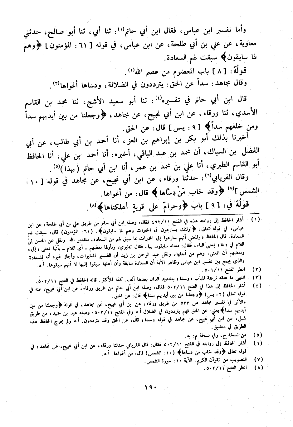قَالَ ابْن أبي حَاتِم فِي تَفْسِيره ثَنَا أَبُو سعيد الْأَشَج ثَنَا مُحَمَّد بن الْقَاسِم الْأَسدي ثَنَا وَرْقَاء عَن ابْن أبي نجيح عَن مُجَاهِد {وَجَعَلْنَا مِنْ بَيْنِ أَيْدِيهِمْ سَدًّا وَمِنْ خَلْفِهِمْ سَدًّا} 9 يس قَالَ عَن الْحق